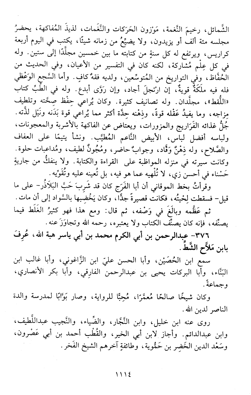 376 - عَبْد الرَّحْمَن بْن أَبِي الكرم مُحَمَّد بْن أَبِي ياسر هبة اللَّه، عُرِف بابن ملّاح الشَّطّ. [المتوفى: 597 هـ]