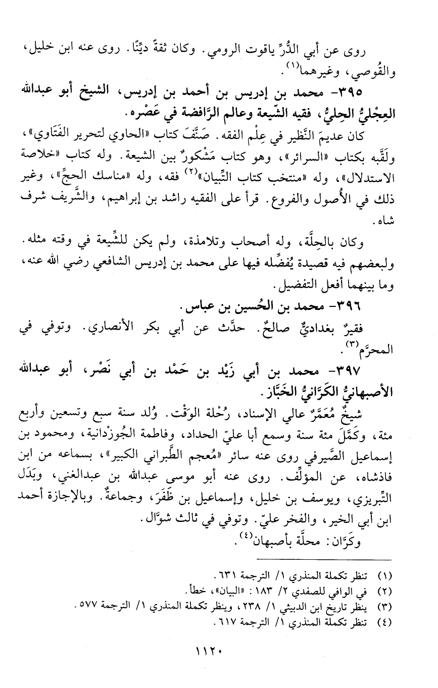 395 - مُحَمَّد بْن إدريس بْن أَحْمَد بْن إدريس، الشيخ أبو عبد الله العجلي الحلي، فقيه الشيعة وعالم الرافضة في عصره. [المتوفى: 597 هـ]