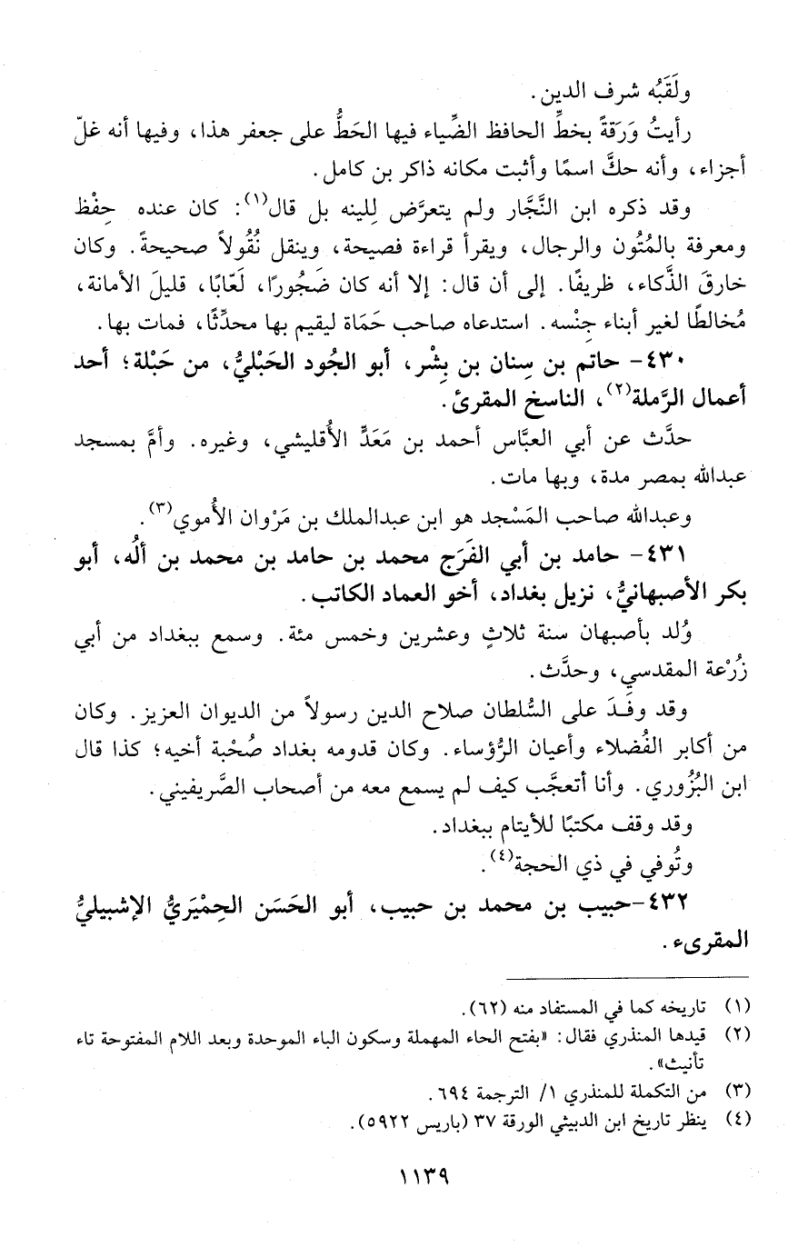 430 - حاتم بْن سِنان بْن بِشْر، أبو الجود الحبلي من حبلة، أحد أعمال الرملة، الناسخ المقرِئ. [المتوفى: 598 هـ]