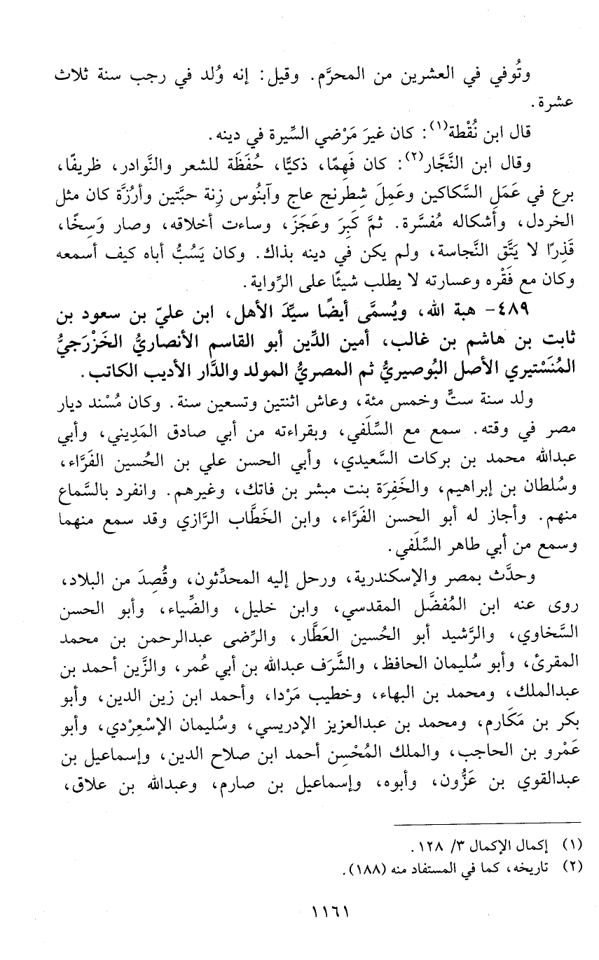 489 - هبة الله، ويسمى أيضًا سيد الأهل، ابن علي بن سعود بْن ثابت بْن هاشم بْن غالب، أمين الدّين، أبو القاسم الأَنْصَاري، الخَزْرَجيّ، المنسْتِيريّ الأصل، البُوصِيريّ، ثُمَّ الْمَصْرِيّ المولد والدّار، الأديب الكاتب. [المتوفى: 598 هـ]