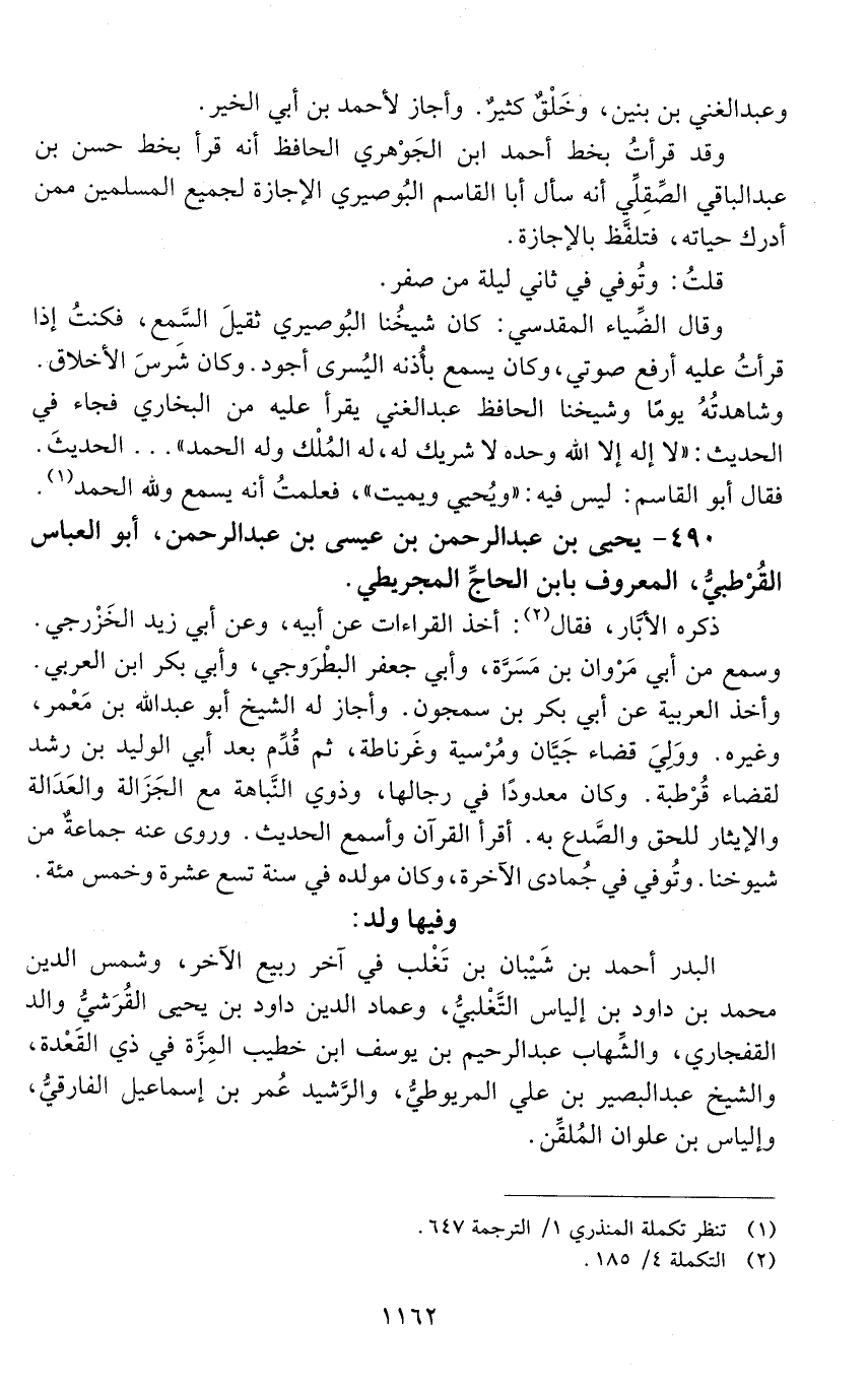 490 - يحيى بْن عَبْد الرَّحْمَن بْن عِيسَى بْن عَبْد الرَّحْمَن، أبو العبّاس القُرْطُبيّ، المعروف بابن الحاجّ المجريطيّ. [المتوفى: 598 هـ]