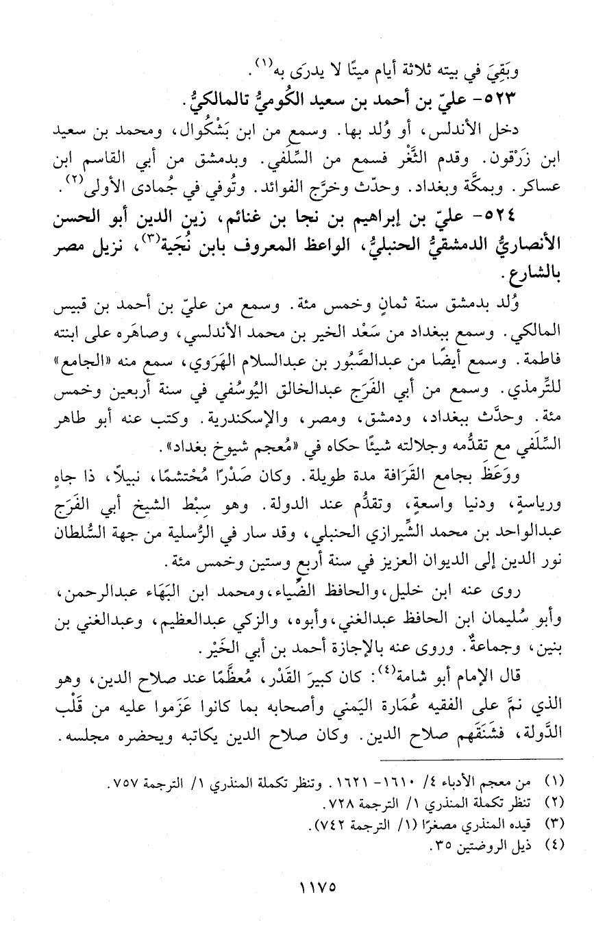 524 - عليّ بْن إِبْرَاهِيم بْن نجا بْن غنائم، زين الدّين، أبو الْحَسَن، الْأَنْصَارِيّ، الدَّمشقيّ، الحنبليّ، الواعظ المعروف بابن نُجَيَّة، [المتوفى: 599 هـ]