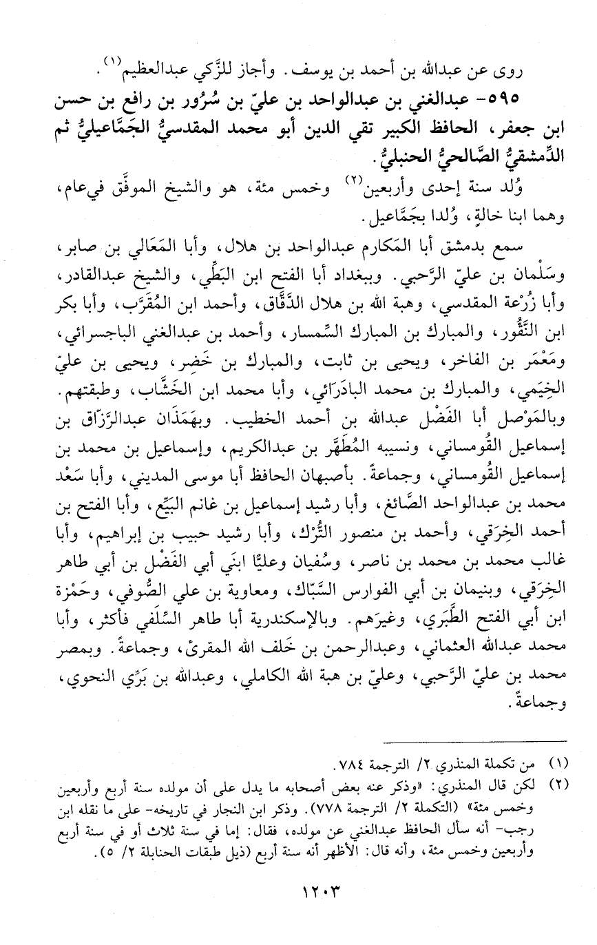595 - عَبْد الغَنِيّ بْن عَبْد الواحد بْن عَلِيّ بْن سُرُور بْن رافع بْن حسن بْن جَعْفَر. الحافظ الكبير، تقيّ الدِّين، أَبُو مُحَمَّد المَقْدِسِيّ الجمَّاعيليّ، ثُمَّ الدَّمشقيّ، الصّالحي، الحنبليّ. [المتوفى: 600 هـ]
