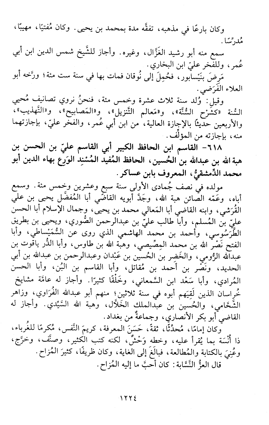618 - القاسم ابن الحافظ الكبير أَبِي القاسم عليّ بْن الْحَسَن بْن هبة اللَّه بْن عَبْد اللَّه بْن الْحُسَيْن. الحافظ، المفيد، المُسْنِد، الورع، بهاء الدّين أبو مُحَمَّد الدَّمشقيّ، المعروف بابن عساكر. [المتوفى: 600 هـ]