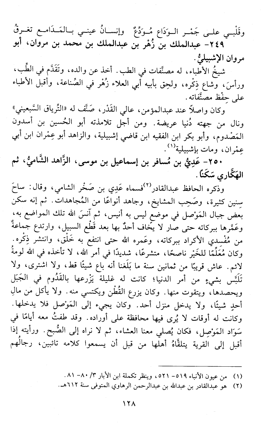 250 - عَدِيُّ بْن مسافر بْن إِسْمَاعِيل بْن مُوسَى، الزَّاهد الشَّاميّ، ثُمَّ الهَكَّاريّ سَكَنًا. [المتوفى: 557 هـ]