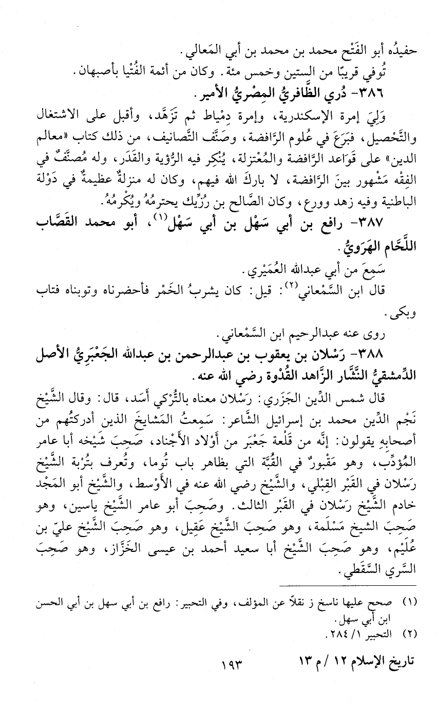 388 - رسلان بْن يَعْقُوب بْن عَبْد الرَّحْمَن بْن عبد الله، الجعبري الأصل، الدمشقي النشار الزّاهد القُدْوة، رَضِيَ اللَّه عَنْهُ. [الوفاة: 551 - 560 هـ]