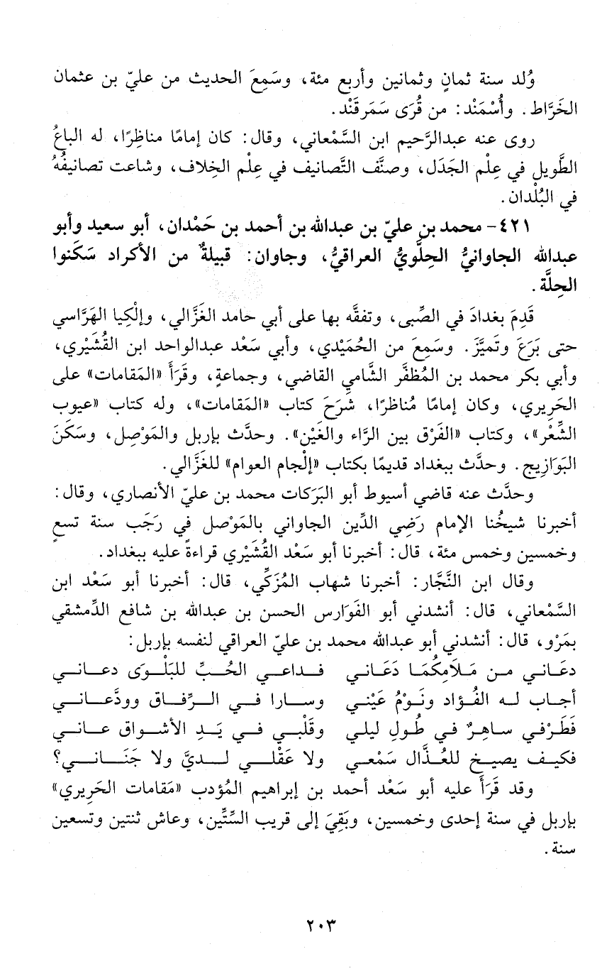 421 - مُحَمَّد بْن عَلِيّ بن عَبْد اللَّه بْن أَحْمَد بْن حمدان، أبو سَعِيد وأبو عَبْد اللَّه الجاوانيّ الحِلَّويّ العراقيّ، [الوفاة: 551 - 560 هـ]