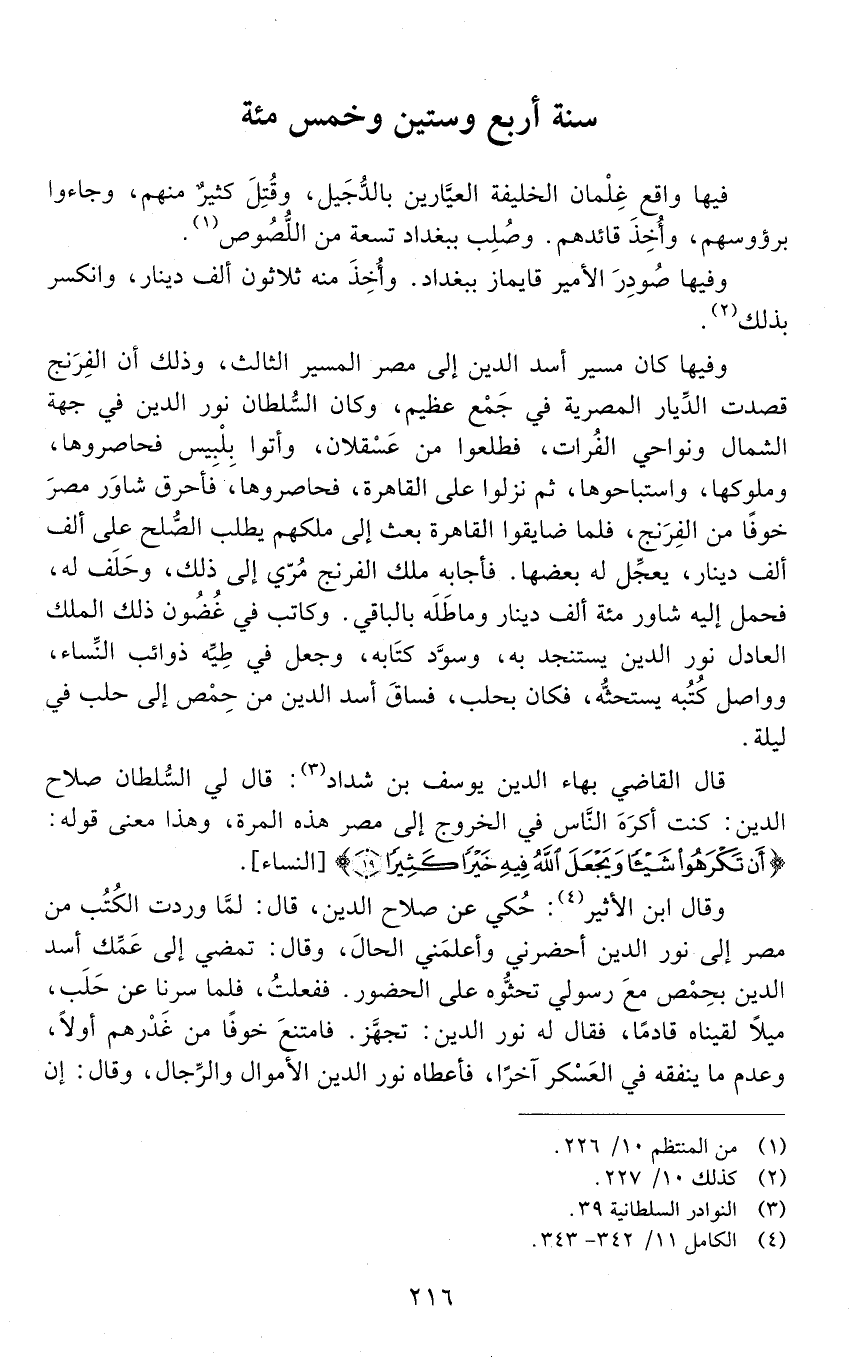 قَالَ القاضي بهاء الدّين يوسف بْن شدّاد: قَالَ لي السّلطان صلاح الدّين: كنت أُكْرهُ النّاسَ فِي الخروج إلى مصر هذه المرَّة، وهذا معنى قوله: (أَنْ تَكْرَهُوا شَيْئًا وَيَجْعَلَ اللَّهُ فِيهِ خَيْرًا كثيرا).