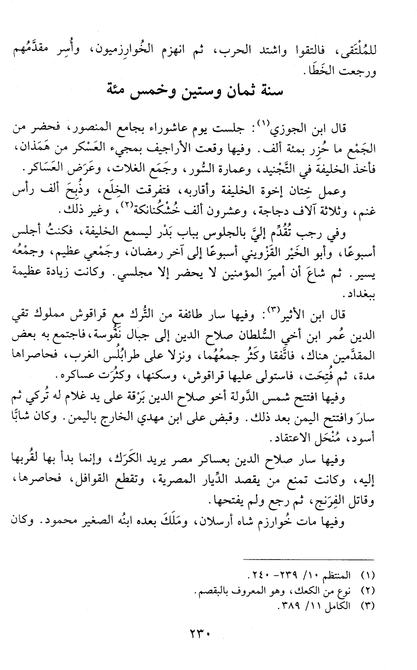 وفيها سار نور الدّين إلى بلاد الشّرق، فصلّى فِي جامع المَوْصِل الَّذِي بناه، وتصدّق بمالٍ عظيم، ثمّ ردّ وقطع الفُرات، وقصد ناحية الروم فافتتح بهسنا ومرعش، وردّ إلى الشّام ومعه ابن الدّانشمنْد ووعده بخلاص بلاده، فبعث قلج أرسلان إلى نور الدّين يخضع لَهُ، وأن يردّ إلى ابن الدّانشمنْد قِلاعه، فشرط عَلَيْهِ نور الدّين تجديدَ إسلامه، لأن قلج أرسلان اتهم بالزندقة، -[232]- وأنه متى طلب منه عسكره ينجده بِهِ، وأن يزوِّج بِنْت قلج أرسلان بابن أخيه سيف الدّين غازي صاحب الموصل. ففعل، وبعث نور الدّين فِي خدمة ابن الدّانشمنْد عسكرًا صُحبة الأمير فخر الدّين عَبْد المسيح إلى مَلَطْيَة وسِيواس، فلمّا مات نور الدّين عادت البلاد إلى قلج أرسلان.