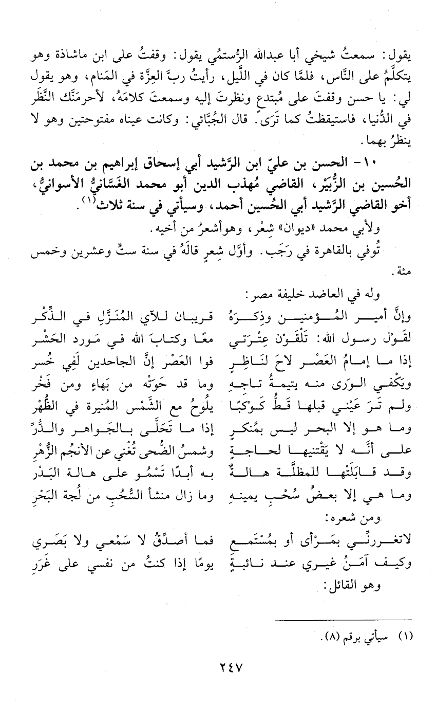 10 - الْحَسَن بن علي ابن الرّشيد أَبِي إِسْحَاق إِبْرَاهِيم بْن مُحَمَّد بْن الْحُسَيْن بْن الزُّبَيْر، القاضي مهذّب الدّين، أَبُو مُحَمَّد الغسّانيّ الأُسْوانيّ، [المتوفى: 561 هـ]