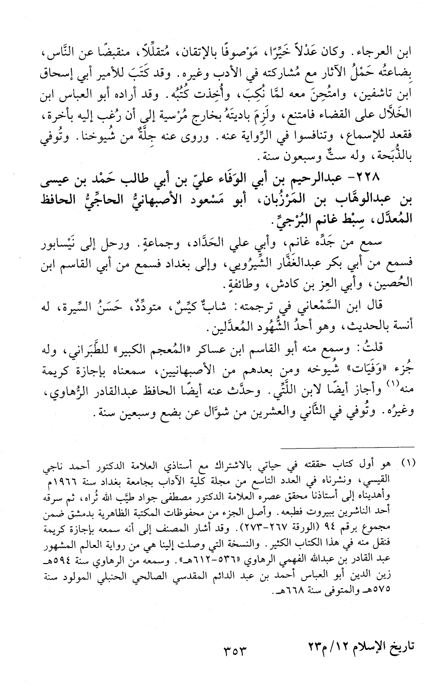 228 - عَبْد الرحيم بْن أَبِي الوفاء علي بْن أَبِي طَالِب حمد بْن عيسى بْن عَبْد الوهّاب بْن المَرْزُبان، أَبُو مَسْعُود الإصبهانيّ، الحاجّيّ، الحافظ، المعدّل، [المتوفى: 566 هـ]