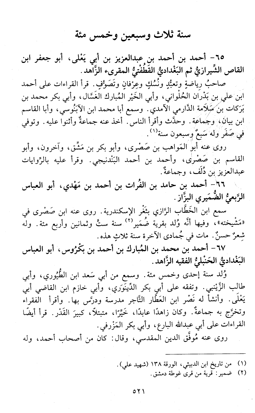 67 - أَحْمَد بْن مُحَمَّد بْن المبارك بْن أَحْمَد بْن بكْرُوس، أَبُو الْعَبَّاس البغدادي الحنبلي الفقيه الزاهد. [المتوفى: 573 هـ]