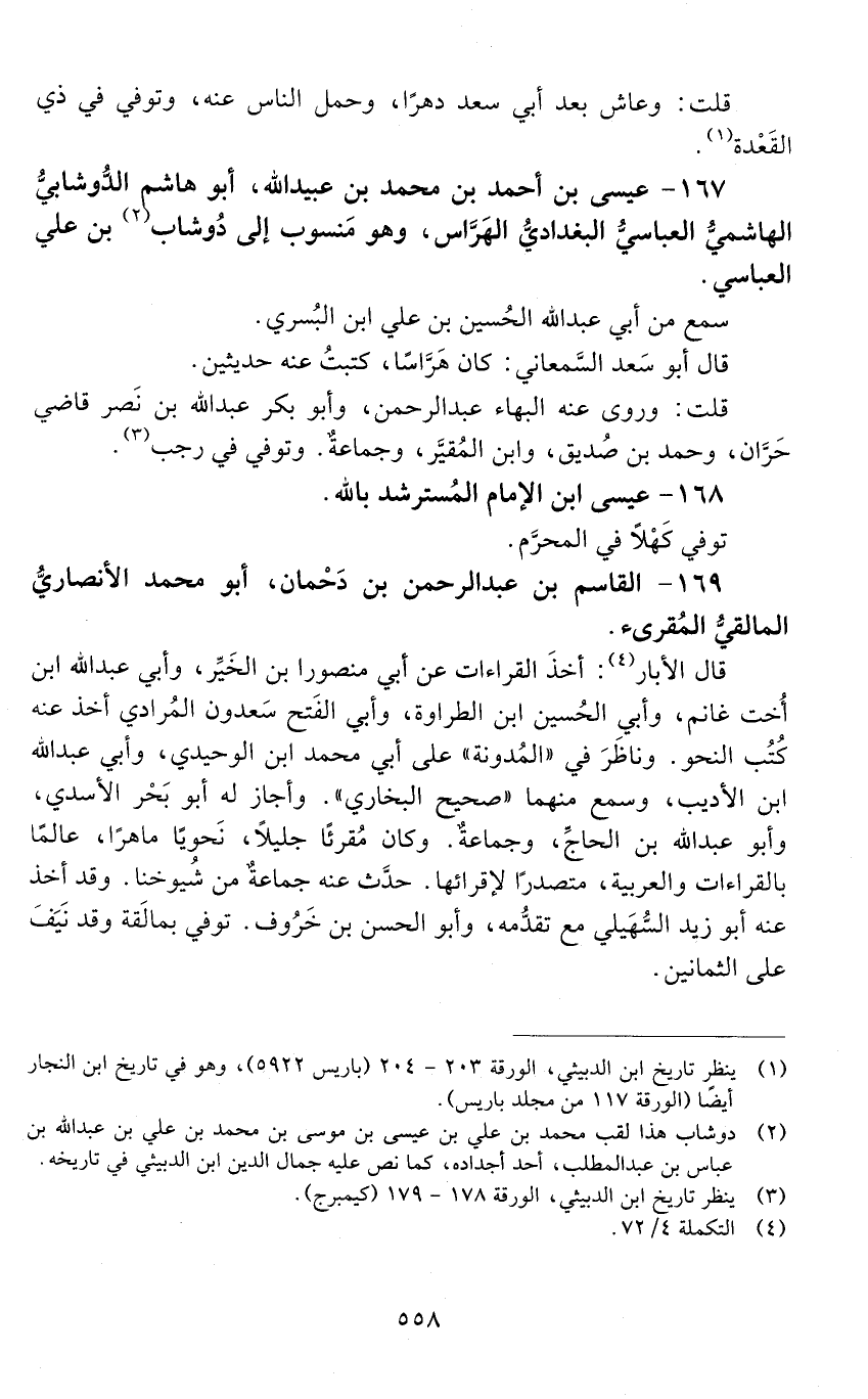 167 - عيسى بْن أَحْمَد بْن مُحَمَّد بْن عُبَيْد اللَّه، أَبُو هاشم الدُّوشابي، الهاشمي، العباسي، البغدادي، الهراس. [المتوفى: 575 هـ]