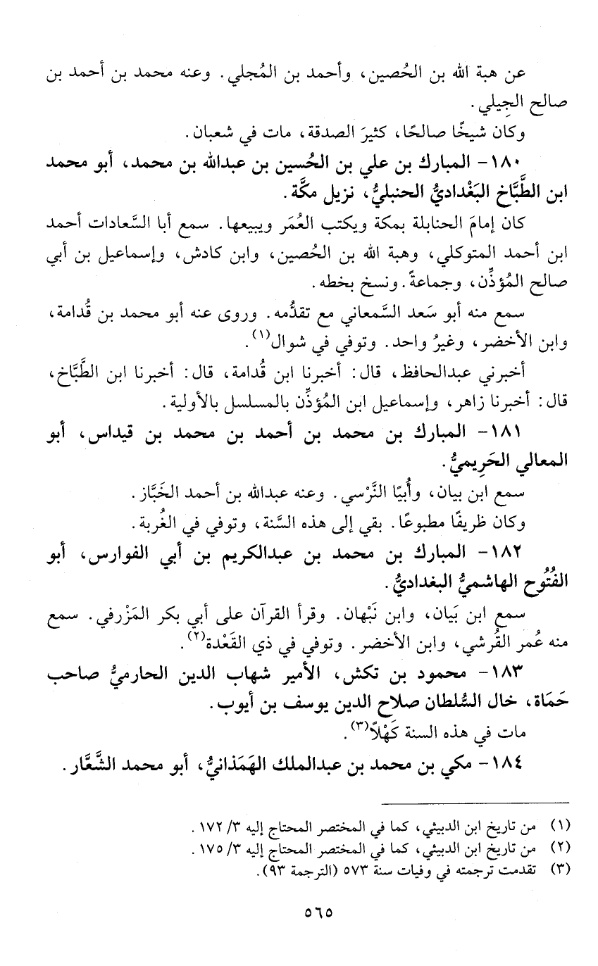 180 - المبارك بْن علي بْن الْحُسَيْن بْن عَبْد اللَّه بْن مُحَمَّد، أَبُو مُحَمَّد بْن الطباخ البغدادي، الحنبلي. [المتوفى: 575 هـ]