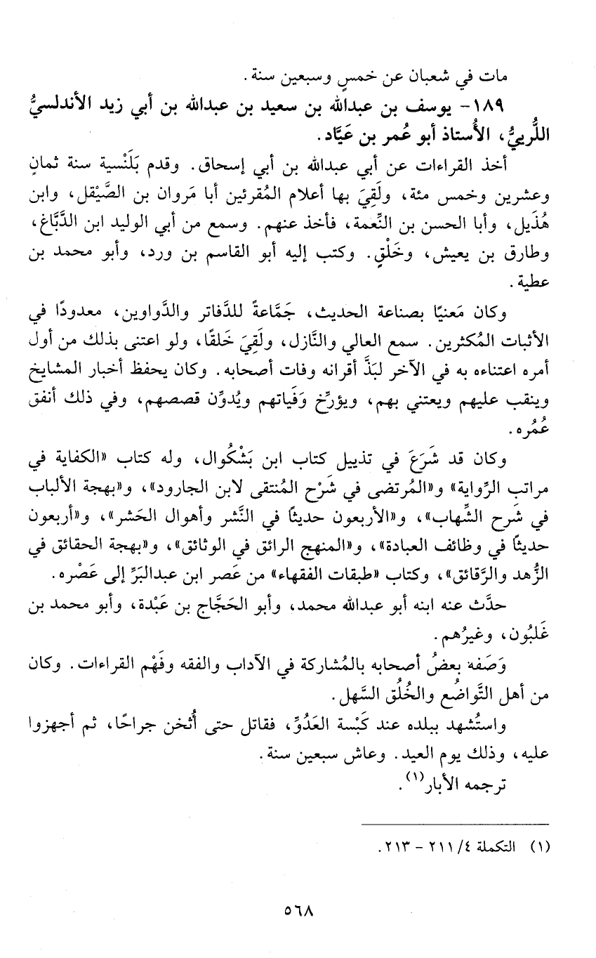 189 - يوسف بْن عَبْد اللَّه بْن سَعِيد بْن عَبْد اللَّه بْن أَبِي زيد الأندلسي اللُّرييّ الأستاذ أَبُو عُمَر بْن عياد. [المتوفى: 575 هـ]