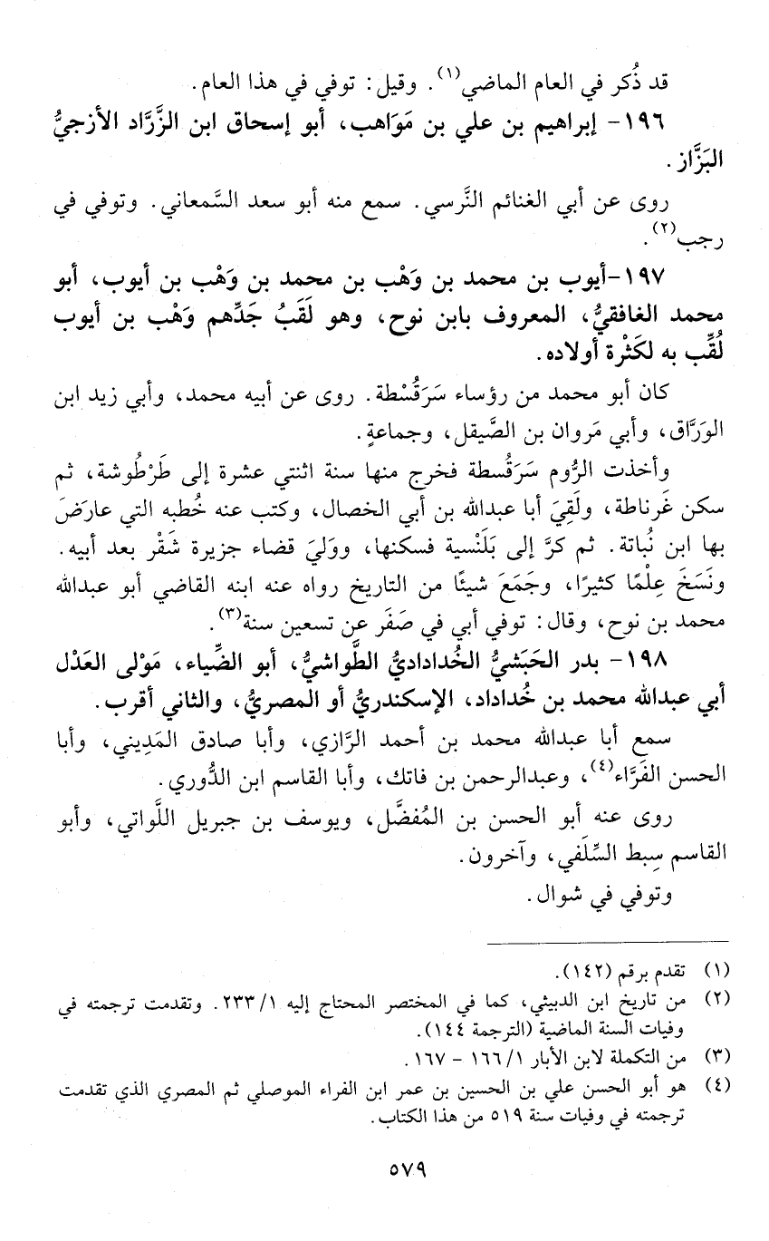 197 - أيوّب بْن مُحَمَّد بْن وهْب بْن مُحَمَّد بْن وهْب بْن أيوب، أَبُو مُحَمَّد الغافقي، المعروف بابن نوح، وهو لَقَب جدهم وهْب بْن أيوب لُقب به لكثرة أولاده. [المتوفى: 576 هـ]