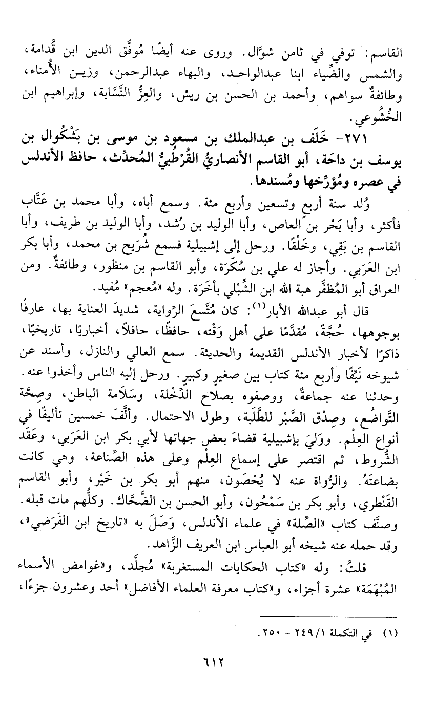 271 - خَلَف بْن عَبْد الملك بْن مَسْعُود بْن مُوسَى بْن بشْكُوال بْن يوسف بْن داحة، أَبُو القاسم الْأَنْصَارِيّ، القُرْطُبيّ، المحدث، [المتوفى: 578 هـ]