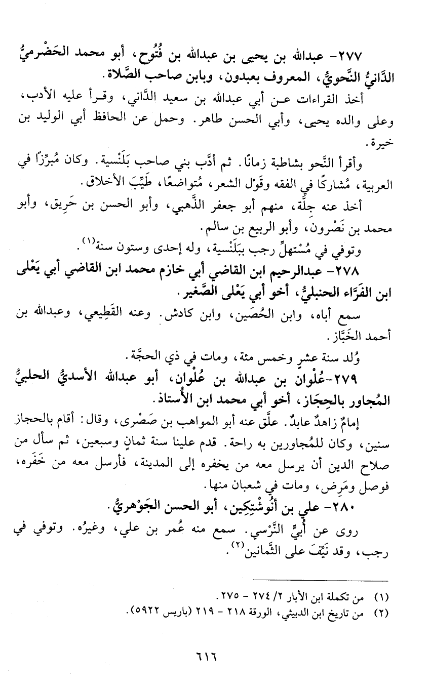 277 - عَبْد اللَّه بْن يحيى بْن عَبْد اللَّه بْن فُتُوح، أَبُو مُحَمَّد الحضرمي، الداني النحوي، المعروف بعبدون، وبابن صاحب الصلاة. [المتوفى: 578 هـ]