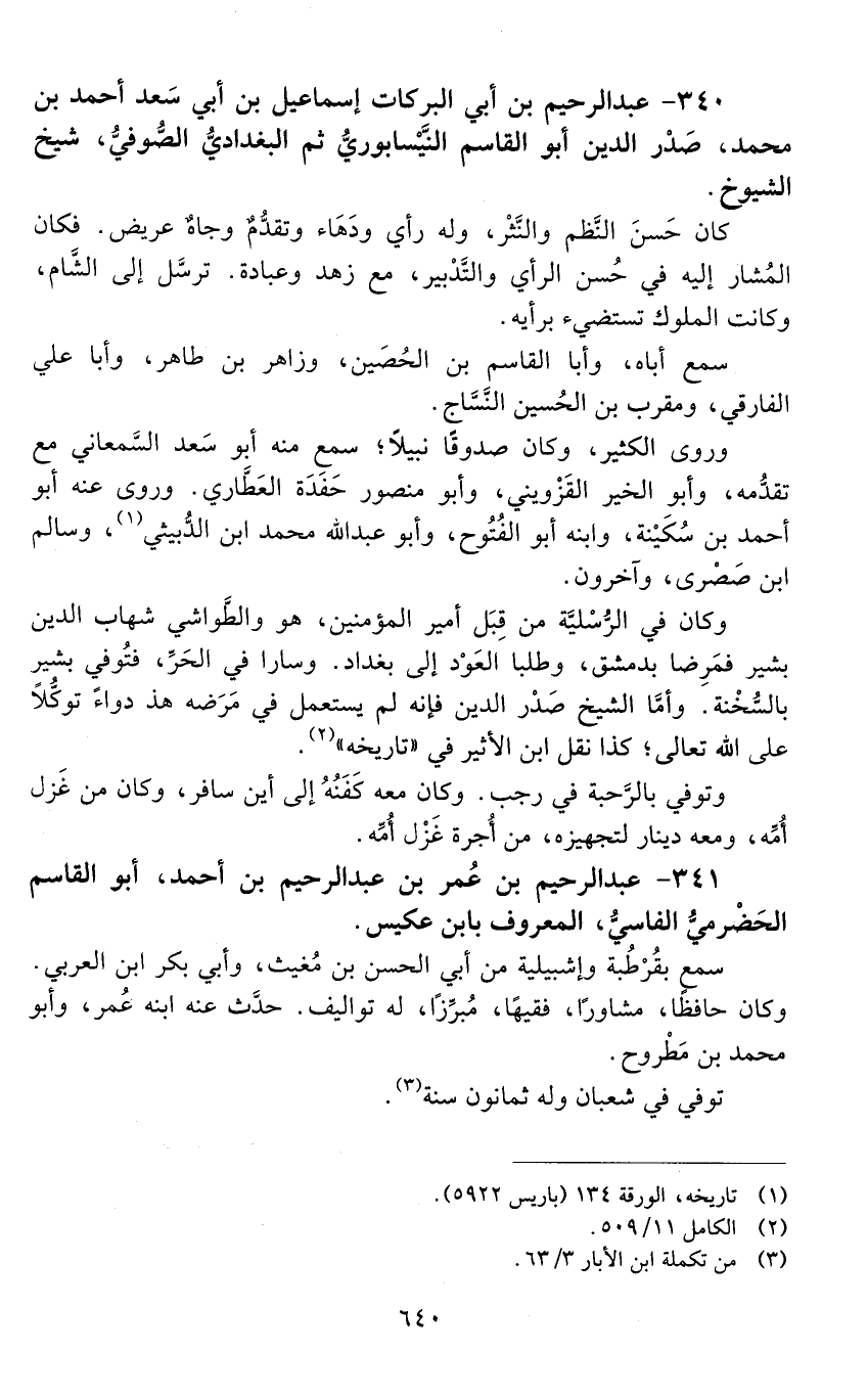 340 - عَبْد الرحيم بْن أَبِي البركات إِسْمَاعِيل بْن أَبِي سعد أَحْمَد بْن مُحَمَّد. صدر الدين أَبُو القاسم النيْسابوري، ثم البغدادي، الصُّوفي. [المتوفى: 580 هـ]