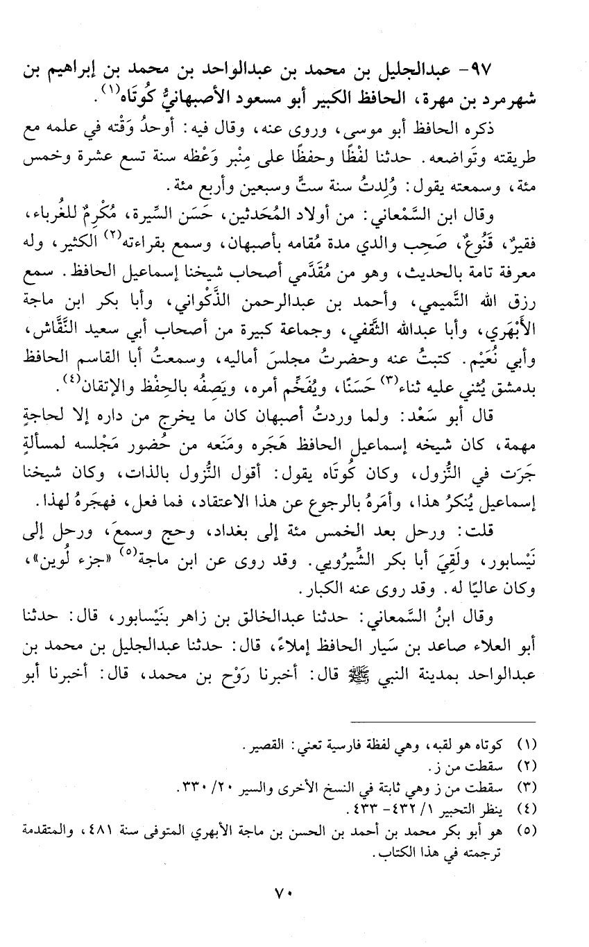 97 - عَبْد الجليل بن مُحَمَّد بْن عَبْد الواحد بْن مُحَمَّد بْن إِبْرَاهِيم بْن شهرمرد بْن مهرة، الحافظ الكبير، أبو مَسْعُود الإصبهانيّ كُوتَاه. [المتوفى: 553 هـ]