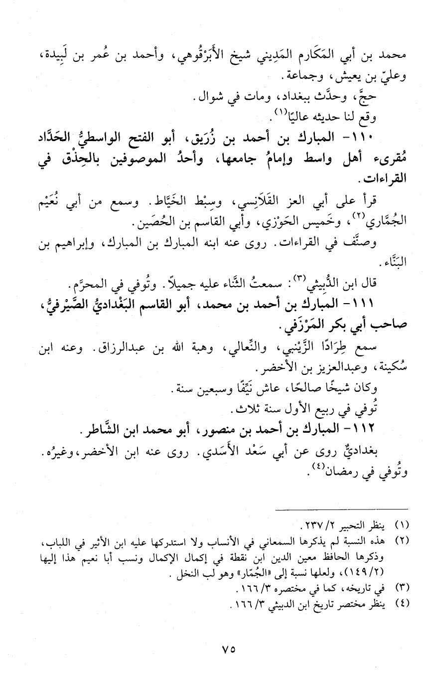 110 - المبارك بْن أَحْمَد بْن زُرَيق، أبو الفتح الواسطيّ، الحدّاد، مقرئ أهل واسط وإمام جامعها، وأحد الموصوفين بالحذق في القراءات. [المتوفى: 553 هـ]