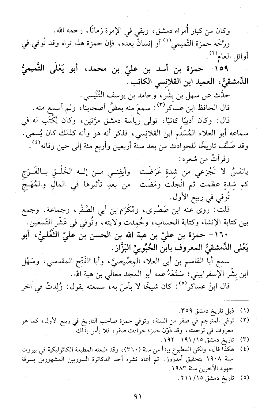 159 - حمزة بْن أسد بْن عليّ بْن مُحَمَّد، أبو يعلى التميمي، الدمشقي، العميد ابن القلانِسِيّ، الكاتب. [المتوفى: 555 هـ]