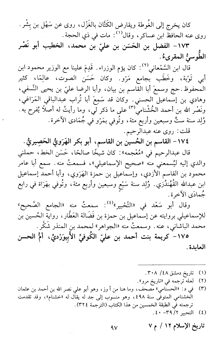 173 - الفضل بْن الْحَسَن بْن عليّ بْن مُحَمَّد، الخطيب أبو نصر الطُّوسيّ، المقرئ. [المتوفى: 555 هـ]