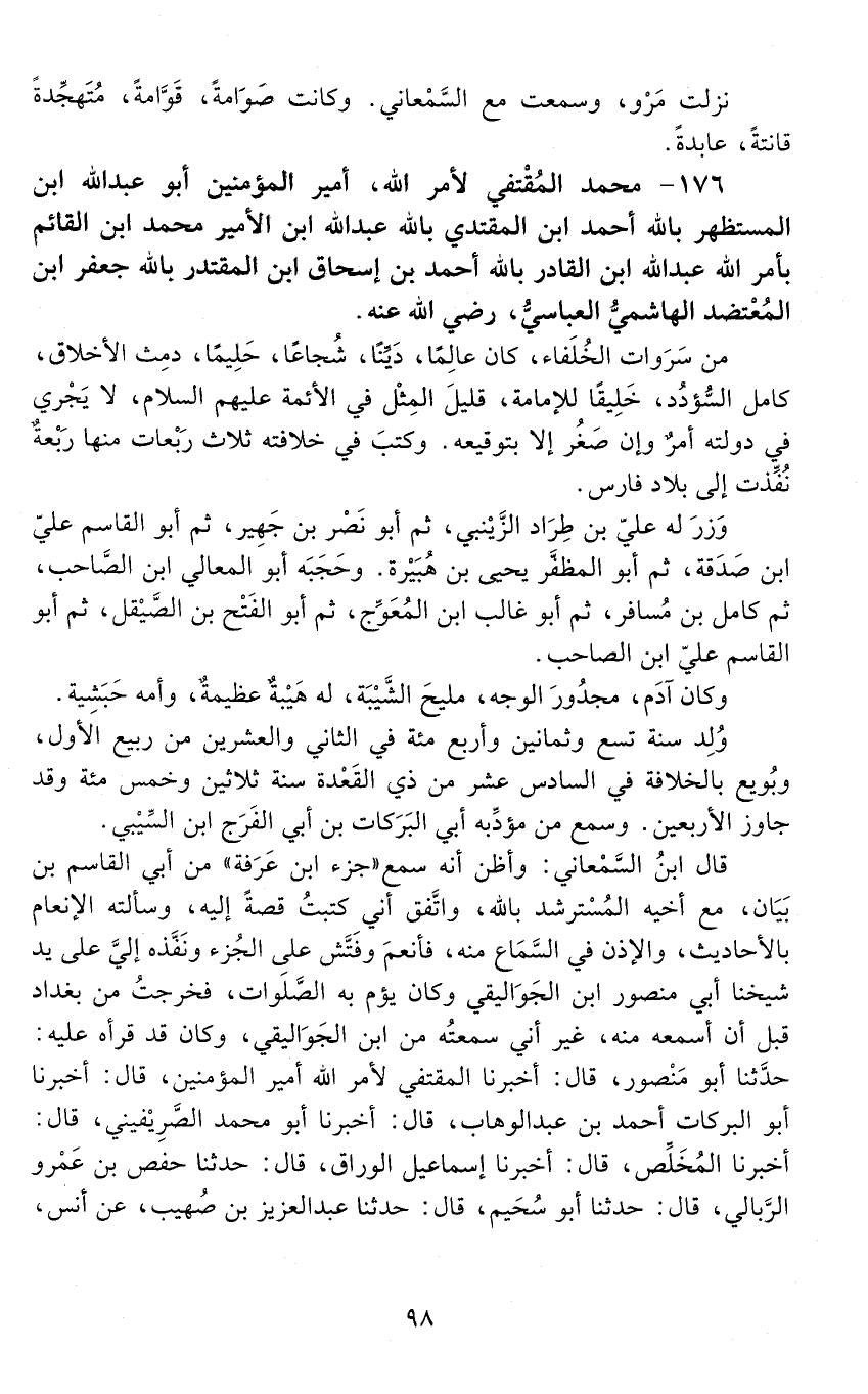 176 - مُحَمَّد المقتفي لأمر اللَّه، أمير المؤمنين أبو عبد الله ابن المستظهر بالله أحمد ابن المقتدي بالله عبد الله ابن الأمير محمد ابن القائم بأمر الله عبد الله ابن القادر بالله أحمد بن إسحاق ابن المقتدر بالله جعفر ابن المعتضد الهاشميّ الْعَبَّاسيّ، رَضِيَ اللَّه عَنْهُ. [المتوفى: 555 هـ]