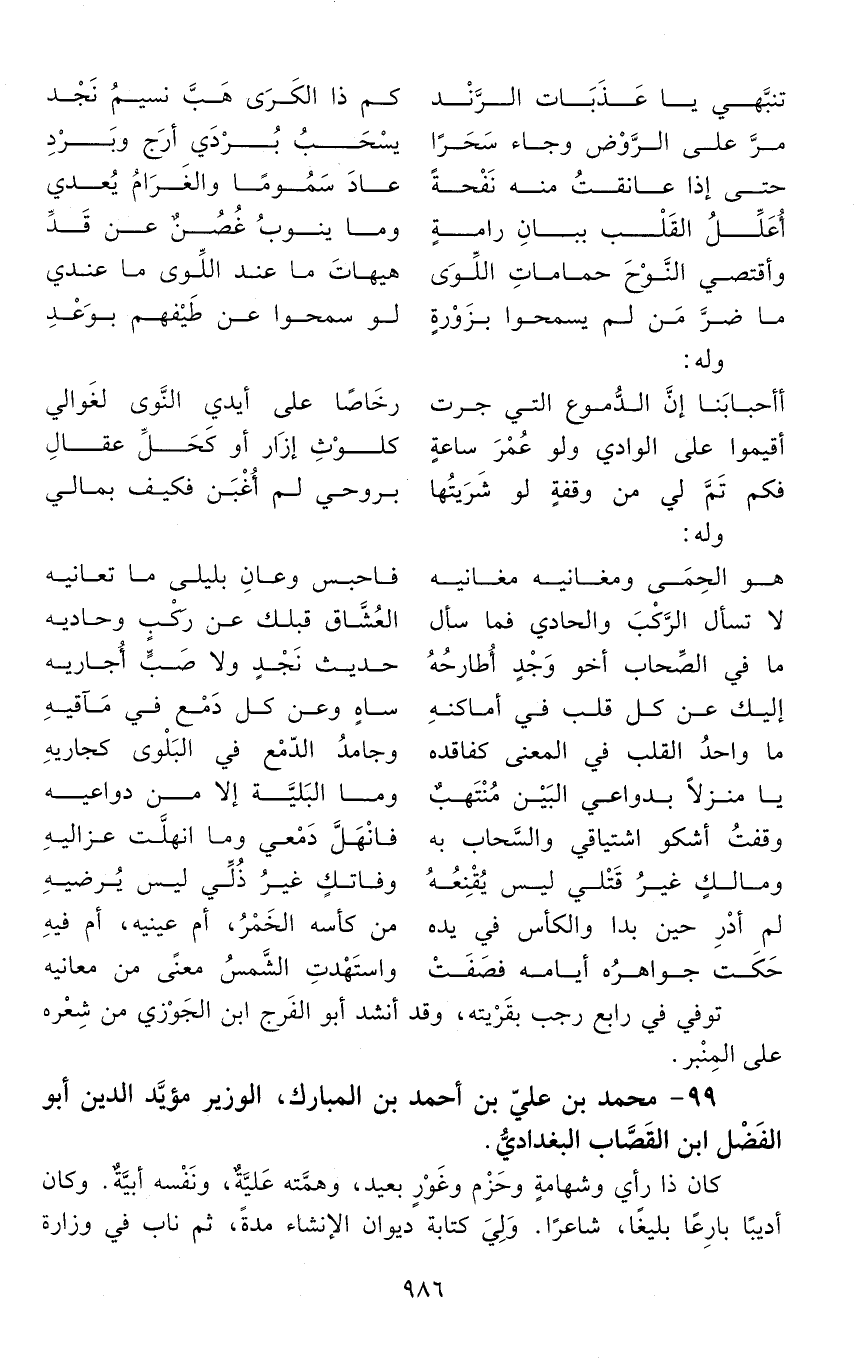 99 - مُحَمَّد بْن علي بْن أَحْمَد بْن الْمُبَارَك الوزير مؤيَّد الدين، أبو الفضل ابن القصّاب الْبَغْدَادِيّ. [المتوفى: 592 هـ]