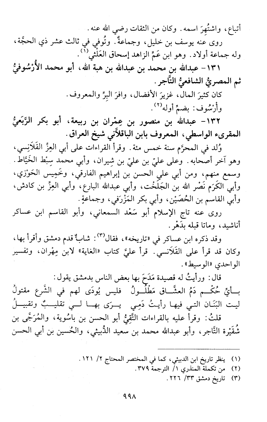 131 - عَبْدِ اللَّهِ بْنِ مُحَمَّدِ بْنِ عَبْدِ اللَّهِ بْن هبة اللَّه، أبو مُحَمَّد الأُرْسُوفيّ، ثُمَّ الْمَصْرِيّ، الشّافعيّ، التّاجر. [المتوفى: 593 هـ]