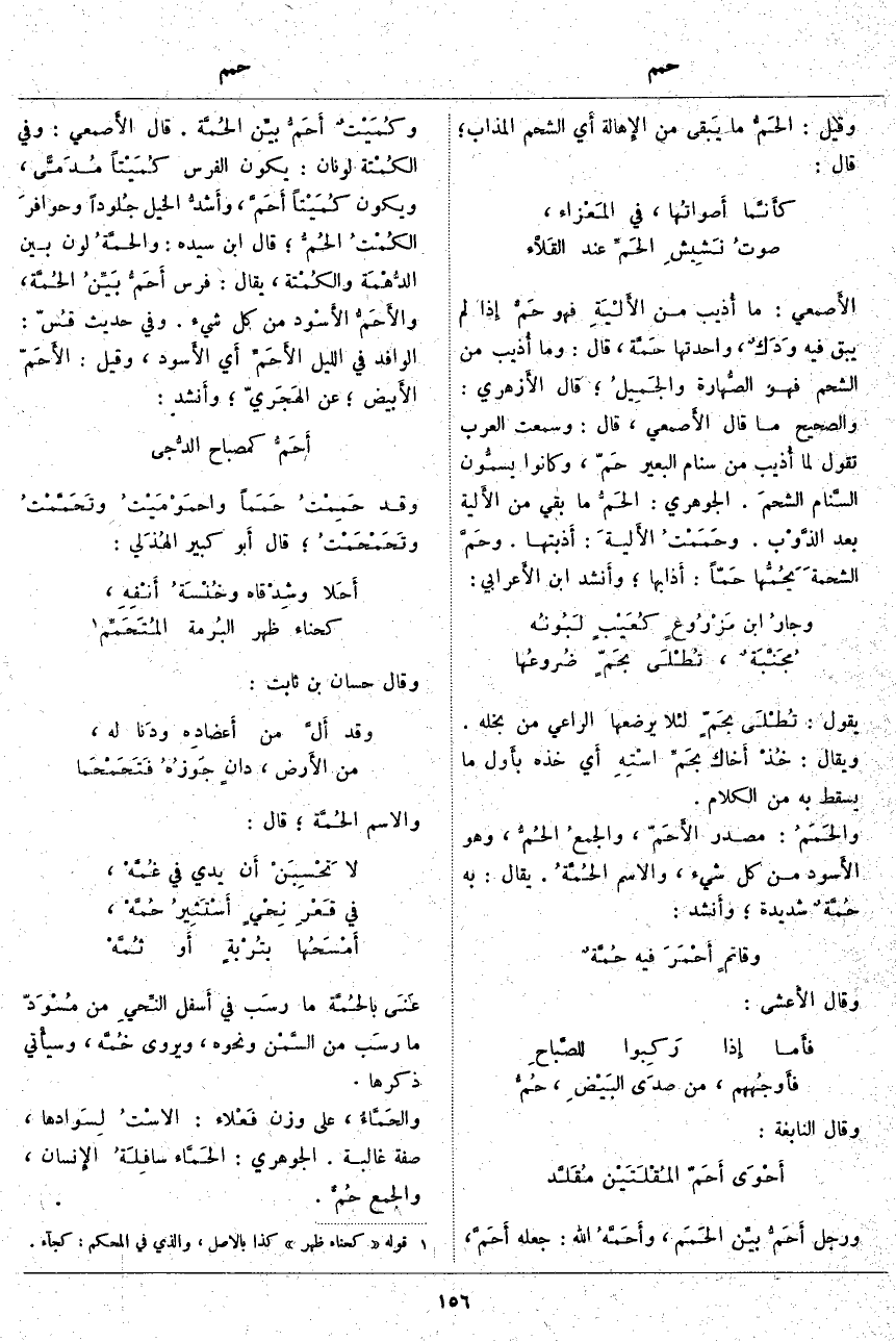 يَقُولُ: تُطْلَى بَحمّ لِئَلَّا يُرْضِعَهَا الرَّاعِي مِنْ بُخْلِهِ. وَيُقَالُ: خُذْ أَخاك بحَمِّ اسْتِهِ أَي خُذْهُ بأَول مَا يُسْقِطُ بِهِ مِنَ الْكَلَامِ. والحَمَمُ: مَصْدَرُ الأَحَمّ، والجمعُ الحُمُّ، وَهُوَ الأَسود مِنْ كُلِّ شَيْءٍ، وَالِاسْمُ الحُمَّةُ. يُقَالُ: بِهِ حُمَّةٌ شَدِيدَةٌ؛ وأَنشد: