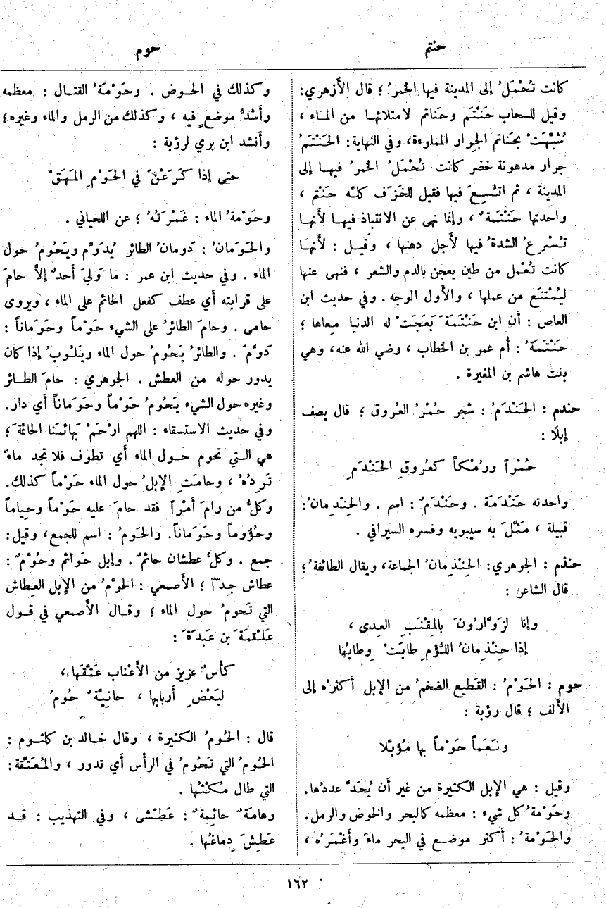 ؛ هِيَ الَّتِي تَحُومُ حَوْلَ الْمَاءِ أَي تَطُوفُ فَلَا تَجِدُ مَاءً تَرِدُهُ، وحامَتِ الإِبلُ حَوْلَ الْمَاءِ حَوْماً كَذَلِكَ. وكلُّ مَنْ رامَ أَمْراً فَقَدْ حامَ عليه حَوْماً وحِياماً وحُؤُوماً وحَوَماناً. والحَومُ: اسْمٌ لِلْجَمْعِ، وَقِيلَ: جَمْعُ. وكلُّ عَطْشَانَ حائمٌ. وإِبل حَوائم وحُوَّمٌ: عِطَاشٌ جِدّاً؛ الأَصمعي: الحوَّمُ مِنَ الإِبل العِطاش الَّتِي تَحومُ حَوْلَ الْمَاءِ؛ وَقَالَ الأَصمعي فِي قَوْلِ عَلْقَمة بْنِ عَبدَةَ: