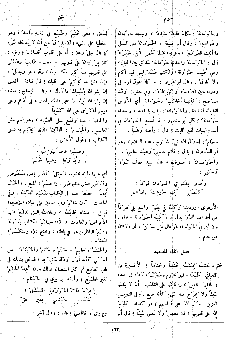 ؛ قِيلَ: مَعْنَاهُ طَابَعُه، وعلامتُه الَّتِي تدفَعُ عَنْهُمُ الأَعراضَ وَالْعَاهَاتِ، لأَن خاتَمَ الْكِتَابِ يَصُونهُ ويمنَعُ النَّاظِرِينَ عَمَّا فِي بَاطِنِهِ، وَتُفْتَحُ تَاؤُهُ وتُكْسَرُ، لُغَتان. والخَتَمُ والخاتِمُ والخاتَمُ والخاتامُ والخَيْتامُ: مِنَ الحَلْي كأَنه أَوّل وَهْلة خُتِمَ بِهِ، فَدَخَلَ بِذَلِكَ فِي بَابِ الطابَع ثُمَّ كَثُرَ اسْتِعْمَالُهُ لِذَلِكَ وإِن أُعِدَّ الخاتَمُ لِغَيْرِ الطَّبْع؛ وأَنشد ابْنُ بَرِّيٍّ فِي الخَيْتام: