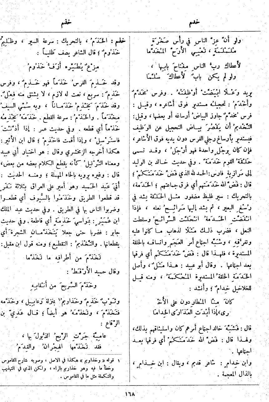 خذم: الخَذَمُ، بِالتَّحْرِيكِ: سُرْعَةُ السَّيْرِ، وظَلِيْمٌ خَذُومٌ؛ قَالَ الشَّاعِرُ يَصِفُ ظَليماً: