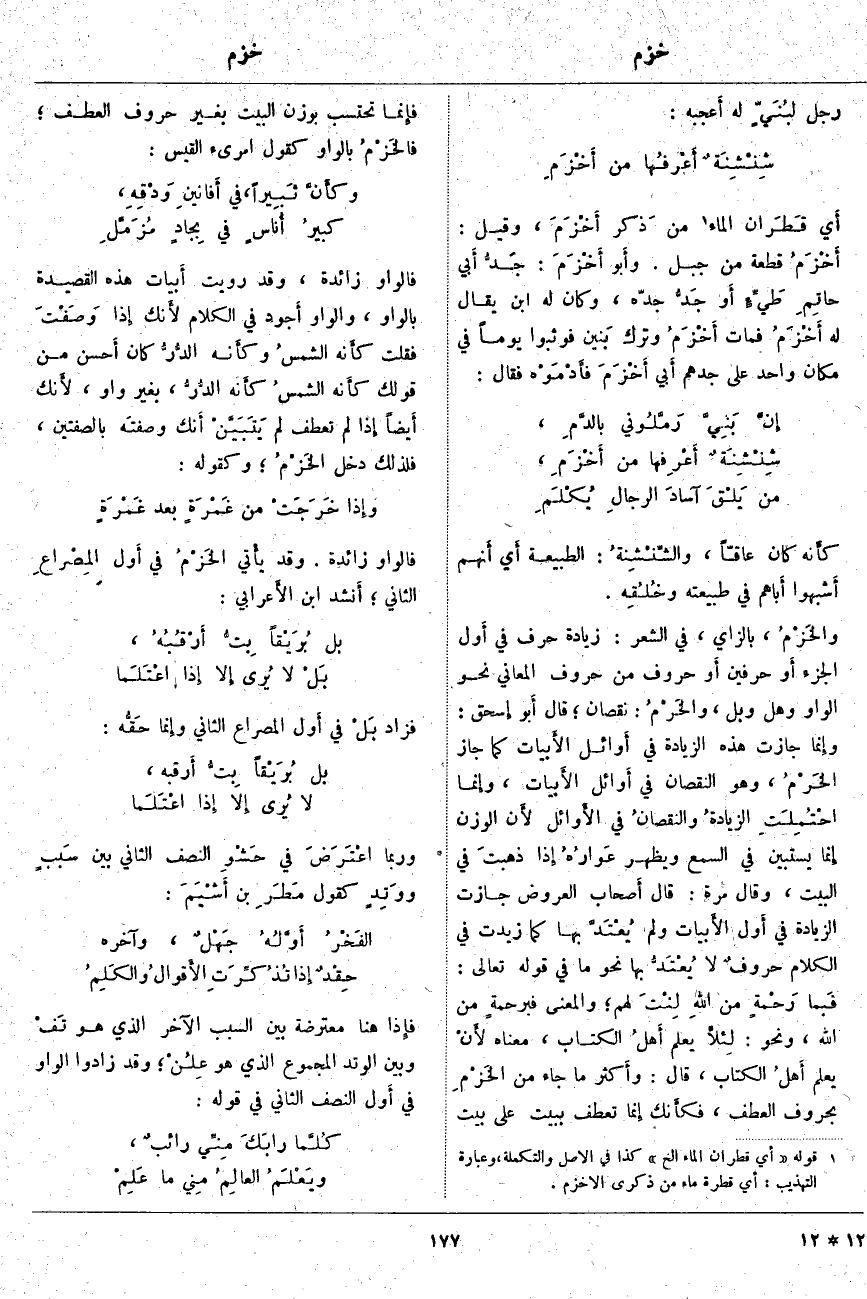 كأَنه كَانَ عَاقًّا، والشِّنْشِنةُ: الطَّبِيعَةُ أَي أَنهم أَشبهوا أَباهم فِي طَبِيعَتِهِ وخُلُقِه. والخَزْمُ، بِالزَّايِ، فِي الشِّعْرِ: زِيَادَةُ حَرْفٍ فِي أَول الْجُزْءِ أَو حَرْفَيْنِ أَو حُرُوفٍ مِنْ حُرُوفِ الْمَعَانِي نَحْوَ الْوَاوِ وَهَلْ وَبَلْ، والخَرْمُ: نُقْصَانٌ؛ قَالَ أَبو إِسحاق: وإِنما جَازَتْ هَذِهِ الزِّيَادَةُ فِي أَوائل الأَبيات كَمَا جَازَ الخَرْمُ، وَهُوَ النُّقْصَانُ فِي أَوائل الأَبيات، وإِنما احْتُمِلَتِ الزيادةُ والنقصانُ فِي الأَوائل لأَن الْوَزْنَ إِنما يَسْتَبِينُ فِي السَّمْعِ وَيَظْهَرُ عَوارُهُ إِذا ذهبتَ فِي الْبَيْتِ، وَقَالَ مُرَّةُ: قَالَ أَصحاب الْعَرُوضِ جَازَتِ الزِّيَادَةُ فِي أَول الأَبيات وَلَمْ يُعْتَدَّ بِهَا كَمَا زِيدَتْ فِي الْكَلَامِ حروفٌ لَا يُعْتَدُّ بِهَا نَحْوَ مَا فِي قَوْلِهِ تَعَالَى: فَبِما رَحْمَةٍ مِنَ اللَّهِ لِنْتَ لَهُمْ؛ وَالْمَعْنَى فبرحمةٍ مِنَ اللَّهِ، وَنَحْوَ: لِئَلَّا يَعْلَمَ أَهْلُ الْكِتابِ، مَعْنَاهُ لأَنْ يَعْلَمَ أَهلُ الْكِتَابِ، قَالَ: وأَكثر مَا جَاءَ مِنَ الخَزْمِ بِحُرُوفِ الْعَطْفِ، فكأَنك إِنما تَعْطِفُ بِبَيْتٍ عَلَى بَيْتٍ فإِنما تَحْتَسِبُ بِوَزْنِ الْبَيْتِ بِغَيْرِ حُرُوفِ الْعَطْفِ؛ فالخَزْمُ بِالْوَاوِ كَقَوْلِ امْرِئِ الْقَيْسِ: