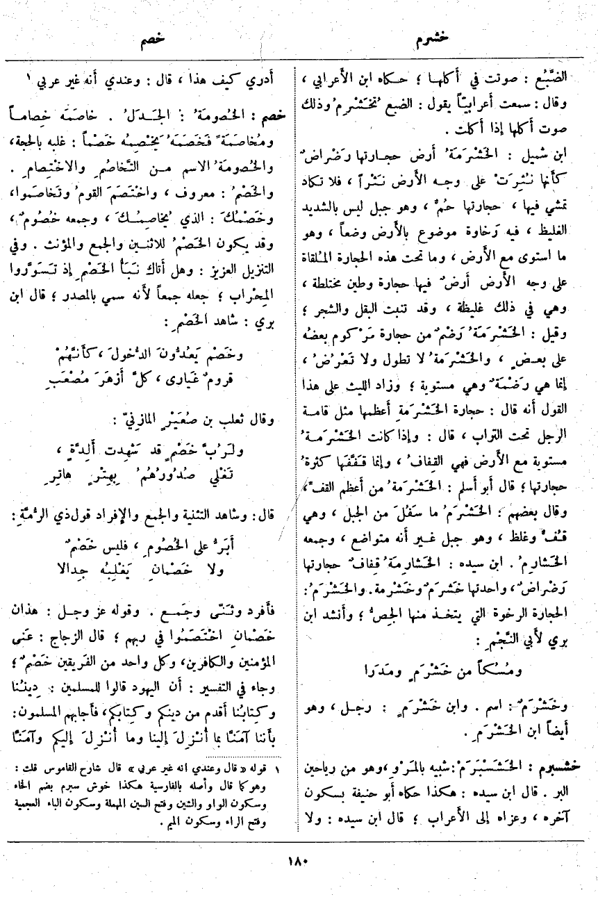 خشسبرم: الخَشَسْبَرَمْ: شَبِيهٌ بالمَرْوِ، وَهُوَ مِنْ رَيَاحِينِ الْبَرِّ. قَالَ ابْنُ سِيدَهْ: هَكَذَا حَكَاهُ أَبو حَنِيفَةَ بِسُكُونِ آخِرِهِ، وَعَزَاهُ إِلى الأَعراب؛ قَالَ ابْنُ سِيدَهْ: وَلَا أَدري كَيْفَ هَذَا، قَالَ: وَعِنْدِي أَنه غَيْرُ عَرَبِيٍّ «1».