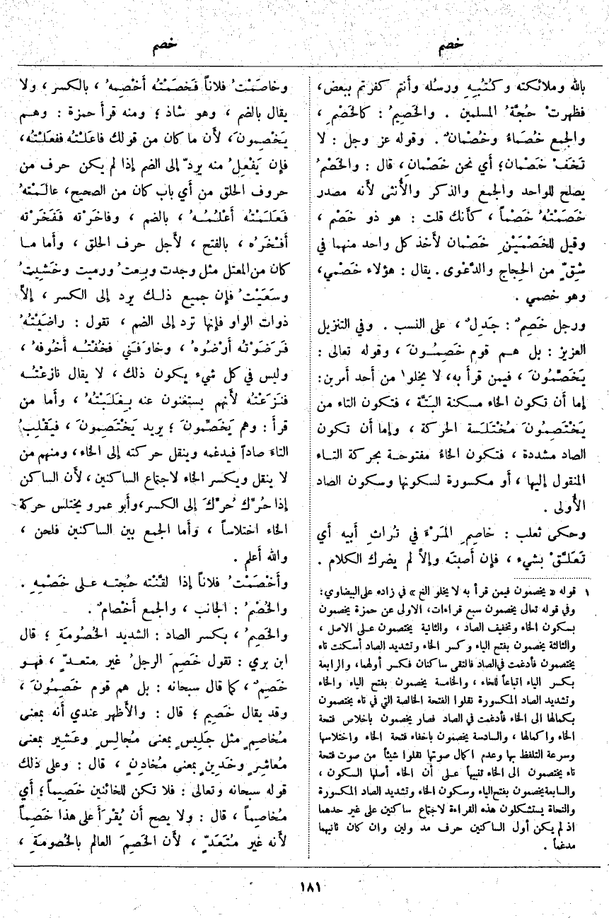 ، فِيمَنْ قرأَ بِهِ، لَا يَخْلُو «1». مِنْ أَحد أَمرين: إِما أَن تَكُونَ الْخَاءُ مُسَكَّنَةً البَتَّة، فَتَكُونُ التَّاءُ مِنْ يَخْتَصِمُونَ مُخْتَلَسة الْحَرَكَةِ، وإِما أَن تَكُونَ الصَّادُ مُشَدَّدَةً، فَتَكُونُ الخاءُ مَفْتُوحَةً بِحَرَكَةِ التَّاءِ الْمَنْقُولِ إِليها، أَو مَكْسُورَةً لِسُكُونِهَا وَسُكُونِ الصَّادِ الأُولى. وَحَكَى ثَعْلَبٌ: خاصِمِ المَرْءَ فِي تُراثِ أَبيه أَي تَعَلَّقْ بِشَيْءٍ، فإِن أَصبتَه وإِلَّا لَمْ يَضُرَّكَ الْكَلَامُ. وخاصَمْتُ فُلَانًا فَخصَمْتُه أَخْصِمهُ، بِالْكَسْرِ، وَلَا يُقَالُ بِالضَّمِّ، وَهُوَ شَاذٌّ؛ وَمِنْهُ قرأَ حَمْزَةُ: