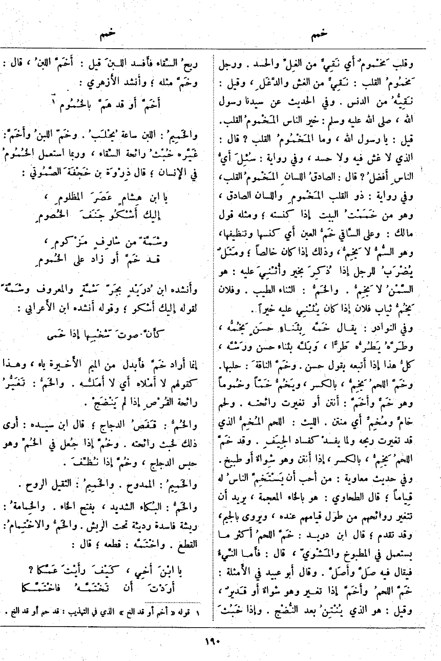 ، وَهُوَ مِنْ خَمَمْتُ الْبَيْتَ إِذا كَنَسْتَهُ؛ وَمِثْلُهُ قَوْلُ مَالِكٍ: وَعَلَى السَّاقي خَمُّ الْعَيْنِ أَي كَنْسُهَا وَتَنْظِيفُهَا، وَهُوَ السُّمُّ لَا يَخِمُّ، وَذَلِكَ إِذا كَانَ خَالِصًا؛ ومَثَلٌ يُضْرَبُ لِلرَّجُلِ إِذا ذُكِرَ بِخَيْرٍ وأُثْنِيَ عَلَيْهِ: هُوَ السَّمْنُ لَا يَخِمُّ. والخَمُّ: الثَّنَاءُ الطَّيِّبُ: وَفُلَانٌ يَخُمُّ ثِيَابَ فُلَانٍ إِذا كَانَ يُثْنِي عَلَيْهِ خَيْرًا. وَفِي النَّوَادِرِ: يُقَالُ خَمَّه بِثَناءٍ حسَنٍ يَخُمُّه، وطَرَّهُ يَطُرُّه طَرّاً، وبَلَّه بِثَنَاءٍ حَسَنٍ ورَشَّه، كلُّ هَذَا إِذا أَتبعه بِقَوْلٍ حَسَنٍ. وخَمَّ الناقةَ: حَلَبَهَا. وخَمَّ اللحمُ يَخِمُّ، بِالْكَسْرِ، ويَخُمُّ خَمّاً وخُموماً وَهُوَ خَمٌّ وأَخَمَّ: أَنتن أَو تَغَيَّرَتْ رَائِحَتُهُ. وَلَحْمٌ خامٌّ ومُخِمٌّ أَي مُنْتِنٌ. اللَّيْثُ: اللَّحْمُ المُخِمُّ الَّذِي قَدْ تَغَيَّرَتْ رِيحُهُ وَلَمَّا يفسدْ كَفَسَادِ الجِيَفِ. وَقَدْ خَمَّ اللحمُ يَخِمُّ، بِالْكَسْرِ، إِذا أَنتن وَهُوَ شِواءٌ أَو طَبِيخٌ. وَفِي حَدِيثُ