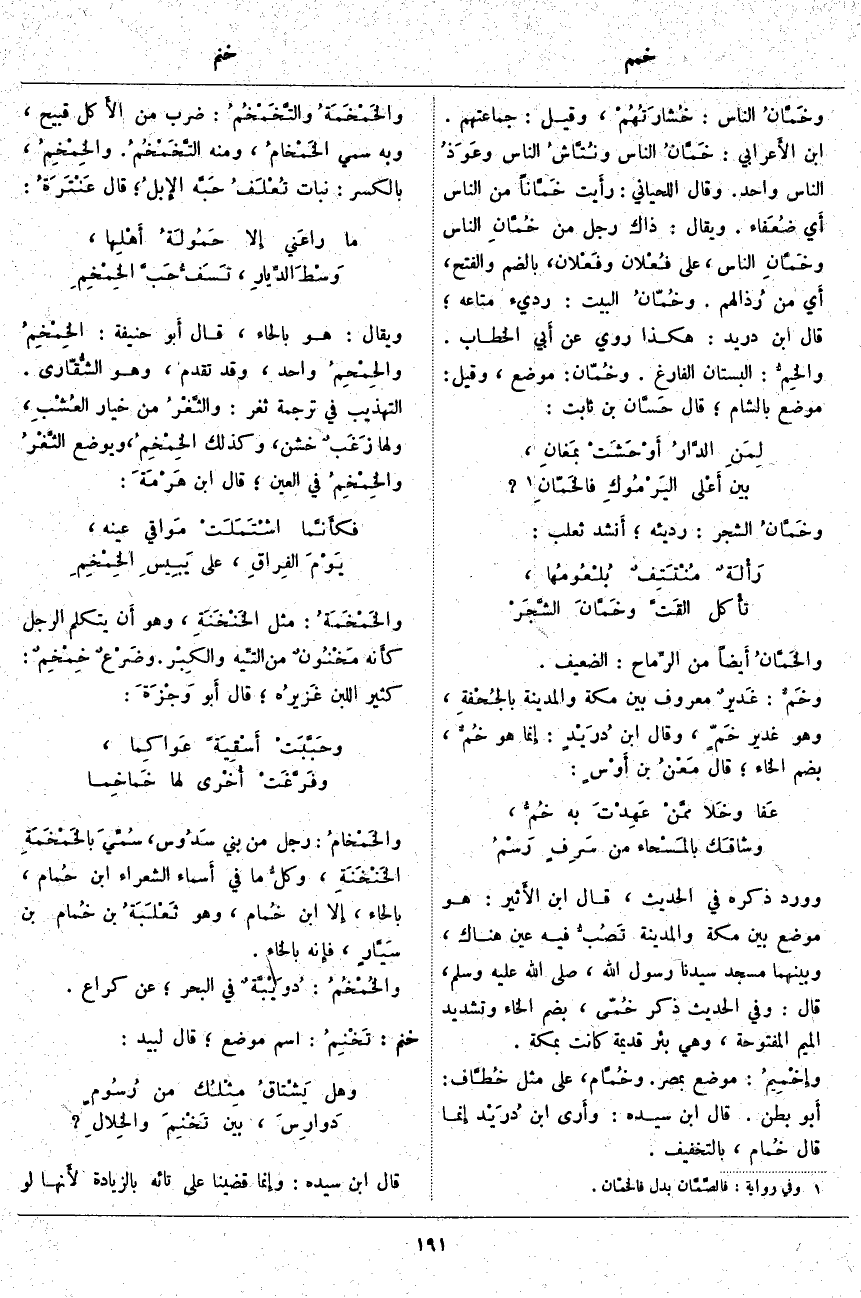 والخَمَّانُ أَيضاً مِنَ الرِّماح: الضَّعِيفُ. وخَمٌّ: غَديرٌ مَعْرُوفٌ بَيْنَ مَكَّةَ وَالْمَدِينَةِ بالجُحْفةِ، وَهُوَ غَدِيرُ خَمّ، وَقَالَ ابْنُ دُرَيْدٍ: إِنما هُوَ خُمٌّ، بِضَمِّ الْخَاءِ؛ قَالَ مَعْنُ بْنُ أَوْسٍ: عَفا وخَلا ممَّنْ عَهِدْتَ بِهِ خُمُّ، وشاقَك بالمَسْحاء مِنْ سَرِفٍ رَسْمُ وَوَرَدَ ذِكْرُهُ فِي الْحَدِيثِ، قَالَ ابْنُ الأَثير: هُوَ مَوْضِعٌ بَيْنَ مَكَّةَ وَالْمَدِينَةِ تَصُبُّ فِيهِ عَيْنٌ هُنَاكَ، وَبَيْنَهُمَا مَسْجِدُ سَيِّدِنَا رَسُولُ اللَّهِ، صَلَّى اللَّهُ عَلَيْهِ وَسَلَّمَ، قَالَ: وَفِي الْحَدِيثِ ذَكَرَ