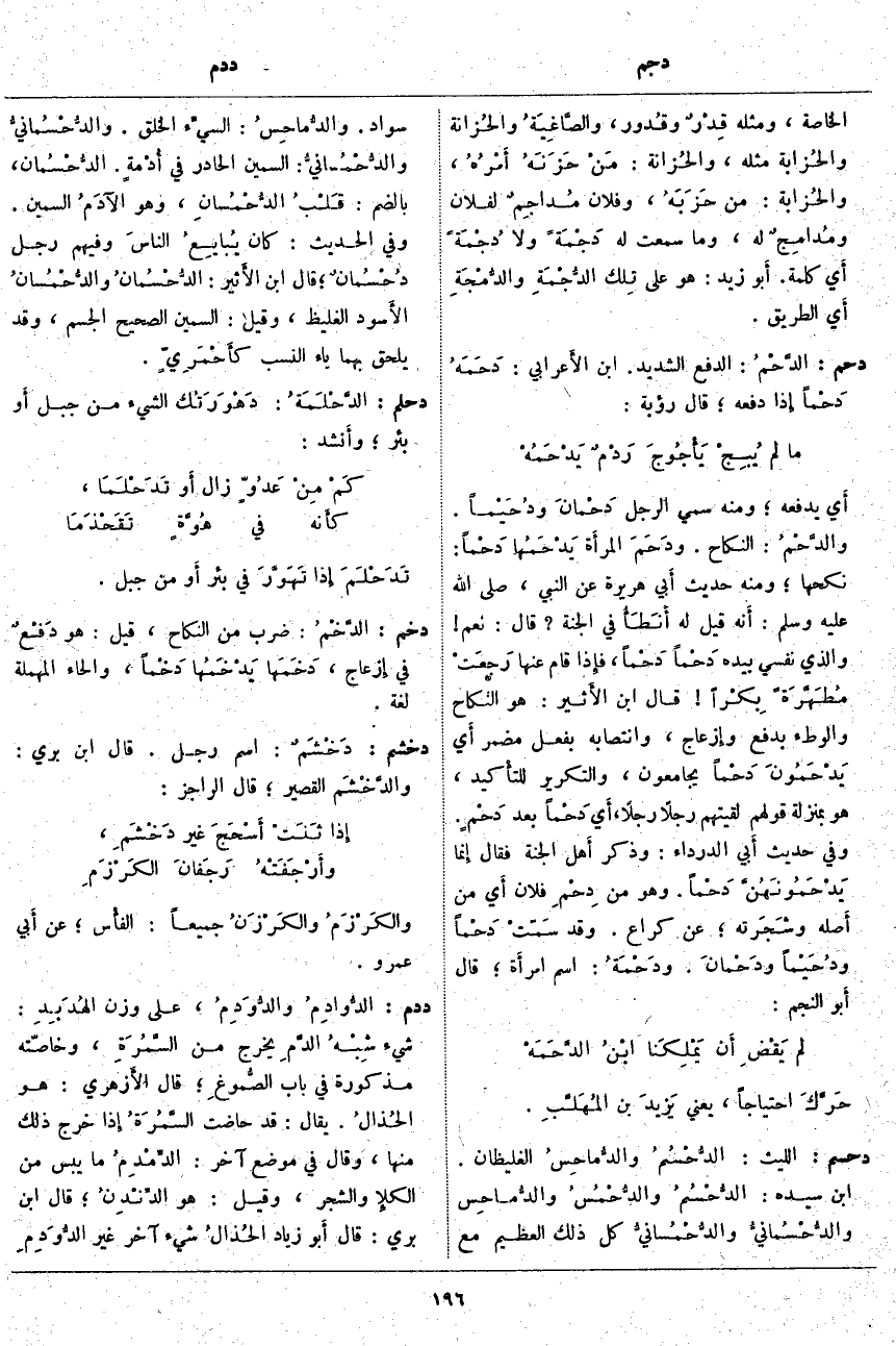 دحسم: اللَّيْثُ: الدُّحْسُمُ والدُّماحِسُ الْغَلِيظَانِ. ابْنُ سِيدَهْ: الدُّحْسُمُ والدُّحْمُسُ والدُّماحِس والدُّحْسُمانيُّ والدُّحْمُسانيُّ كُلُّ ذَلِكَ الْعَظِيمُ مَعَ سواد. الدُّماحِسُ: السيِء الْخُلُقِ. والدُّحْسُمانيُّ والدُّحْمُسانيُّ: السَّمِينُ الْحَادِرُ فِي أُدْمةٍ. الدُّحْسُمان، بِالضَّمِّ: قَلْبُ الدُّحْمُسانِ، وَهُوَ الآدَمُ السَّمِينُ. وَفِي الْحَدِيثِ: