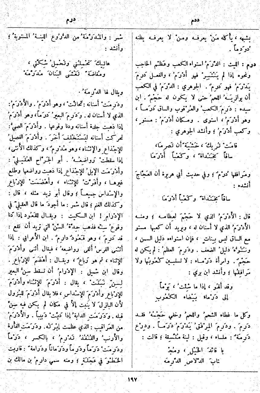 وَيُقَالُ لَهَا الدَّرِمَةُ. ودَرِمَتْ أَسنانه: تحاتَّتْ، وَهُوَ أَدْرَمُ. والأَدْرَمُ: الَّذِي لَا أَسنان لَهُ. وَدَرِمَ البعيرُ دَرَماً، وَهُوَ أَدْرَمُ إِذا ذَهَبَتْ جِلْدَةُ أَسنانه وَدَنَا وُقُوعُهَا. وأَدْرَمَ الصبيُّ: تَحَرَّكَتْ أَسنانه ليَسْتَخْلِفَ أُخَرَ. وأَدْرَمَ الفصيلُ للإِجْذاعِ والإِثْناءِ، وَهُوَ مُدْرِمٌ، وَكَذَلِكَ الأُنثى، إِذا سقطتْ رَواضِعُهُ. أَبو الجَرَّاح العُقَيليّ: وأَدْرَمَت الإِبلُ للإِجْذاعِ إِذا ذَهَبَتْ رَوَاضِعُهَا وَطَلَعَ غَيْرُهَا، وأَفَرَّتْ للإِثْناء، وأَهْضَمَتْ للإِرْباعِ والإِسْداس جَمِيعًا؛ وَقَالَ أَبو زَيْدٍ مِثْلَهُ، قَالَ: وَكَذَلِكَ الْغَنَمُ؛ قَالَ شَمِرٌ: مَا أَجودَ مَا قَالَ الْعُقَيْلِيُّ فِي الإِدْرامِ ابْنُ السِّكِّيتِ: وَيُقَالُ للقَعُود إِذا دَنا وقوعُ سِنِّه فَذَهَبَ حِدَّةُ السِّنِّ الَّتِي تُرِيدُ أَن تَقَعَ: قَدْ دَرِمَ، وَهُوَ قَعُودٌ دارِمٌ. ابْنُ الأَعرابي: إِذا أَثْنى الفرسُ أَلقى رواضِعهُ، فَيُقَالُ أَثنى وأَدْرَمَ للإِثناء، ثُمَّ هُوَ رَباعٌ، وَيُقَالُ: أَهْضَمَ للإِرْباعِ. وَقَالَ ابْنُ شُمَيْلٍ: الإِدْرامُ أَن تَسْقُطَ سِنُّ الْبَعِيرِ لِسِنٍّ نَبَتَتْ، يُقَالُ: أَدْرَمَ للإِثْناء وأَدْرَمَ للإِرْباعِ وأَدْرَمَ للإِسْداسِ، فَلَا يُقَالُ أَدْرَمَ للبُزول لأَن البازِلَ لَا يَنْبُتُ إِلا فِي مَكَانٍ لَمْ يَكُنْ فِيهِ سِنٌّ قَبْلَهُ. ودَرَمَتِ الدابةُ إِذا دَبَّتْ دَبيباً. والأَدْرَمُ مِنَ العَراقيب: الَّذِي عَظُمَتْ إِبْرَتُه. ودَرَمَتِ الفأْرة والأَرنبُ والقُنْفُذُ تَدْرِمُ، بِالْكَسْرِ، دَرْماً ودَرِمَتْ دَرَماً ودَرِماً ودَرَماناً ودَرامةً: قَارَبَتِ الخَطْوَ فِي عَجَلَةٍ؛ وَمِنْهُ سُمِّيَ دارِمُ بْنَ مَالِكِ بْنِ