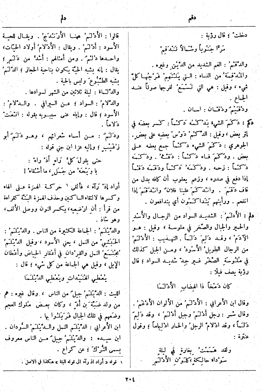 دلم: الأَدلَمُ: الشَّدِيدُ السَّوَادِ مِنَ الرِّجَالِ والأُسْدِ وَالْحَمِيرِ وَالْجِبَالِ والصَّخرِ فِي مُلُوسَةٍ، وَقِيلَ: هُوَ الآدَمُ، وَقَدْ دَلِمَ دَلَماً. التَّهْذِيبُ: الأَدْلَمُ مِنَ الرِّجَالِ الطويلُ الأَسْودُ، وَمِنَ الْجَبَلِ كَذَلِكَ فِي مُلُوسَةِ الصَّخْر غَيْرُ جِدّ شَدِيدِ السَّوَادِ؛ قَالَ رُؤْبَةُ يَصِفُ فِيلًا: