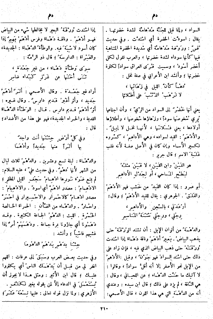 ؛ الادْهِمامُ: مَصْدَرُ ادْهَمَّ أَي اسْوَدَّ. والادْهِيمامُ: مَصْدَرُ ادْهامَّ كالاحْمرار والاحْمِيرار فِي احْمَرَّ واحْمارَّ. والدَّهْماء مِنَ الضأْنِ: الحمراءُ الْخَالِصَةُ الحُمْرةِ. اللَّيْثُ: الدَّهْمُ الْجَمَاعَةُ الْكَثِيرَةُ. وَقَدْ دَهَمُونا أَي جاؤونا بِمَرَّةٍ جَمَاعَةٌ. ودَهَمَهُمْ أَمرٌ إِذا غَشِيَهُمْ فاشِياً؛ وأَنشد: