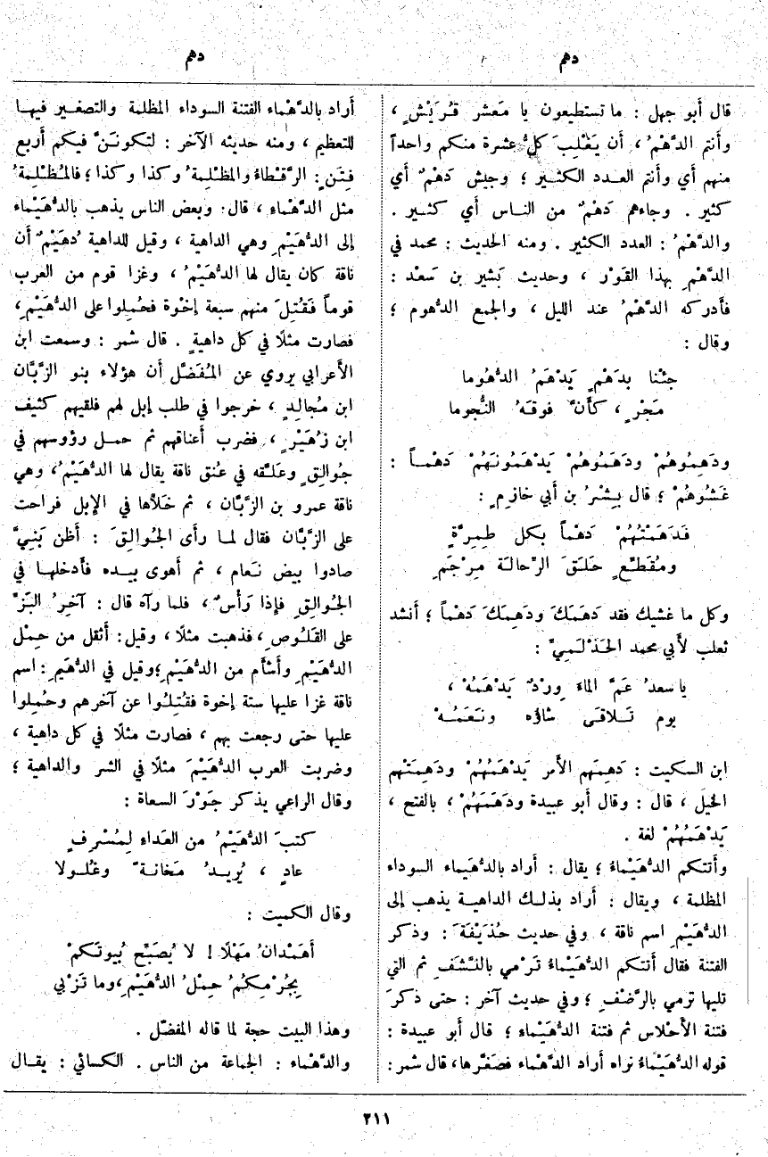 وَهَذَا الْبَيْتُ حَجَّةٌ لِمَا قَالَهُ الْمُفَضَّلُ. والدَّهْماء: الْجَمَاعَةُ مِنَ النَّاسِ. الْكِسَائِيُّ: يُقَالُ