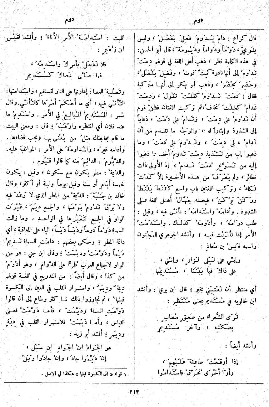 قَالَ كُرَاعٌ: دامَ يَدُومُ فَعِلَ يَفْعُلُ، وَلَيْسَ بقَوِيّ، دَوْماً ودَواماً ودَيْمومَةً؛ قَالَ أَبو الْحَسَنِ: فِي هَذِهِ الْكَلِمَةِ نَظَرٌ، ذَهَبَ أَهل اللُّغَةِ فِي قَوْلِهِمْ دِمْتَ تَدُومُ إِلى أَنها نَادِرَةٌ كمِتَّ تَموتُ، وفَضِلَ يَفْضُلُ، وحَضِرَ يَحْضُرُ، وَذَهَبَ أَبو بَكْرٍ إِلى أَنها مُتَرَكِّبَةٌ فَقَالَ: دُمْتَ تَدُومُ كقُلْتَ تَقُولُ، ودِمْتَ تَدامُ كخِفْتَ تَخافُ، ثُمَّ تَرَكَّبَتِ اللُّغَتَانِ فَظَنَّ قَوْمٌ أَن تَدُومُ عَلَى دِمْتَ، وتَدامُ عَلَى دُمْتَ، ذَهَابًا إِلى الشُّذُوذِ وإِيثاراً لَهُ، والوَجْه مَا تَقَدَّمَ مِنْ أَن تَدامُ عَلَى دِمْتَ، وتَدُومُ عَلَى دُمْتَ، وَمَا ذَهَبُوا إِليه مِنْ تَشْذيذ دِمْتَ تَدومُ أَخف مِمَّا ذَهَبُوا إِليه مِنْ تَسَوُّغِ دُمْتَ تَدامُ، إِذ الأُولى ذَاتُ نَظَائِرَ، وَلَمْ يُعْرَفْ مِنْ هَذِهِ الأَخيرة إِلَّا كُدْتَ تَكادُ، وَتَرْكِيبُ اللُّغَتَيْنِ بَابٌ وَاسِعٌ كَقَنَطَ يَقْنَطُ ورَكَنَ يَرْكَنُ، فَيَحْمِلُهُ جُهَّالُ أَهل اللُّغَةِ عَلَى الشُّذُوذِ. وأَدامَهُ واسْتَدامَهُ: تأَنَّى فِيهِ، وَقِيلَ: طَلَبَ دوَامَهُ، وأَدْومَهُ كَذَلِكَ. واسْتَدَمْتُ الأَمر إِذا تأَنَّيْت فِيهِ؛ وأَنشد الْجَوْهَرِيُّ للمَجْنون وَاسْمُهُ قَيسُ بْنُ مُعاذٍ: