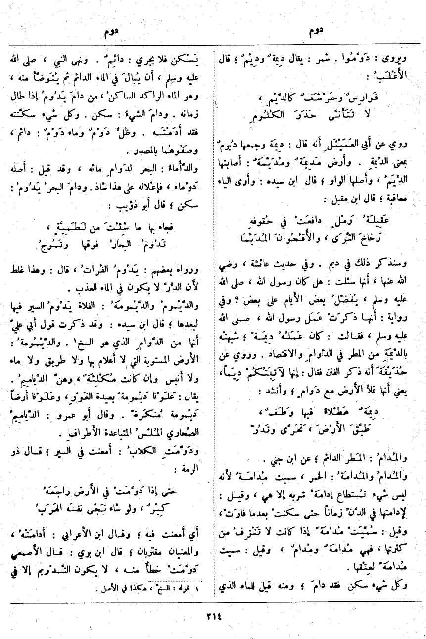 وَرَوَاهُ بَعْضُهُمْ: يَدُومُ الفُراتُ، قَالَ: وَهَذَا غَلَطٌ لأَن الدُّرَّ لَا يَكُونُ فِي الْمَاءِ الْعَذْبِ. والدَّيْمومُ والدَّيْمومَةُ: الْفَلَاةُ يَدُومُ السَّيْرُ فِيهَا لِبُعْدِهَا؛ قَالَ ابْنُ سِيدَهْ: وَقَدْ ذَكَرْتُ قَوْلَ أَبي عَلِيٍّ أَنها مِنَ الدَّوامِ الَّذِي هُوَ السَّخُّ «1». والدَّيْمُومةُ: الأَرض الْمُسْتَوِيَةُ الَّتِي لَا أَعلام بِهَا وَلَا طَرِيقَ وَلَا مَاءَ وَلَا أَنيس وإِن كَانَتْ مُكْلِئَةً، وهنَّ الدَّيامِيمُ. يُقَالُ: عَلَوْنا دَيْمومةً بَعِيدَةَ الغَوْرِ، وعَلَوْنا أَرضاً دَيْمومة مُنكَرةً. وَقَالَ أَبو عَمْرٍو: الدَّيامِيمُ الصَّحاري المُلْسُ الْمُتَبَاعِدَةُ الأَطرافِ. ودَوَّمَتِ الكلابُ: أَمعنت فِي السَّيْرِ؛ قَالَ ذُو الرُّمَّةِ: