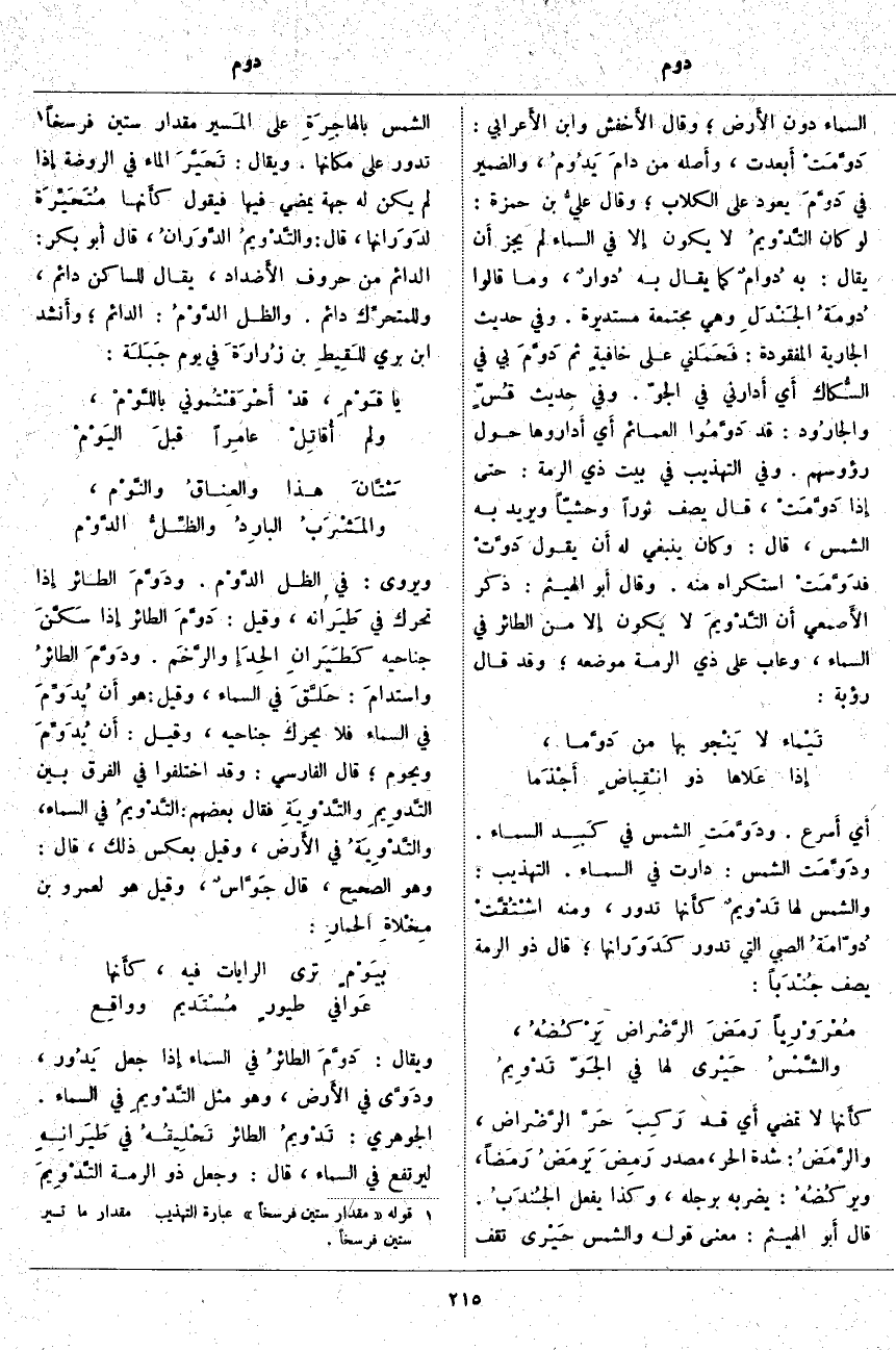 وَيُرْوَى: فِي الظِّلِّ الدَّوْم. ودَوَّمَ الطَّائِرُ إِذا تَحَرَّكَ فِي طَيَرانه، وَقِيلَ: دَوَّمَ الطَّائِرُ إِذا سَكَّنَ جَنَاحَيْهِ كَطَيَرَانِ الحِدَإِ والرَّخَم. ودَوَّمَ الطائرُ واستدامَ: حَلَّقَ فِي السَّمَاءِ، وَقِيلَ: هُوَ أَن يُدَوِّمَ فِي السَّمَاءِ فَلَا يُحَرِّكُ جَنَاحَيْهِ، وَقِيلَ: أَن يُدَوِّمَ وَيَحُومَ؛ قَالَ الْفَارِسِيُّ: وَقَدِ اخْتَلَفُوا فِي الْفَرْقِ بَيْنَ التَّدوِيمِ والتَّدْوِيَةِ فَقَالَ بَعْضُهُمْ: التَّدْويمُ فِي السَّمَاءِ، والتَّدْوِيَةُ فِي الأَرض، وَقِيلَ بِعَكْسِ ذَلِكَ، قَالَ: وَهُوَ الصَّحِيحُ، قَالَ جَوَّاسٌ، وَقِيلَ هُوَ لِعَمْرِو بْنِ مِخْلاةِ الحمارِ: