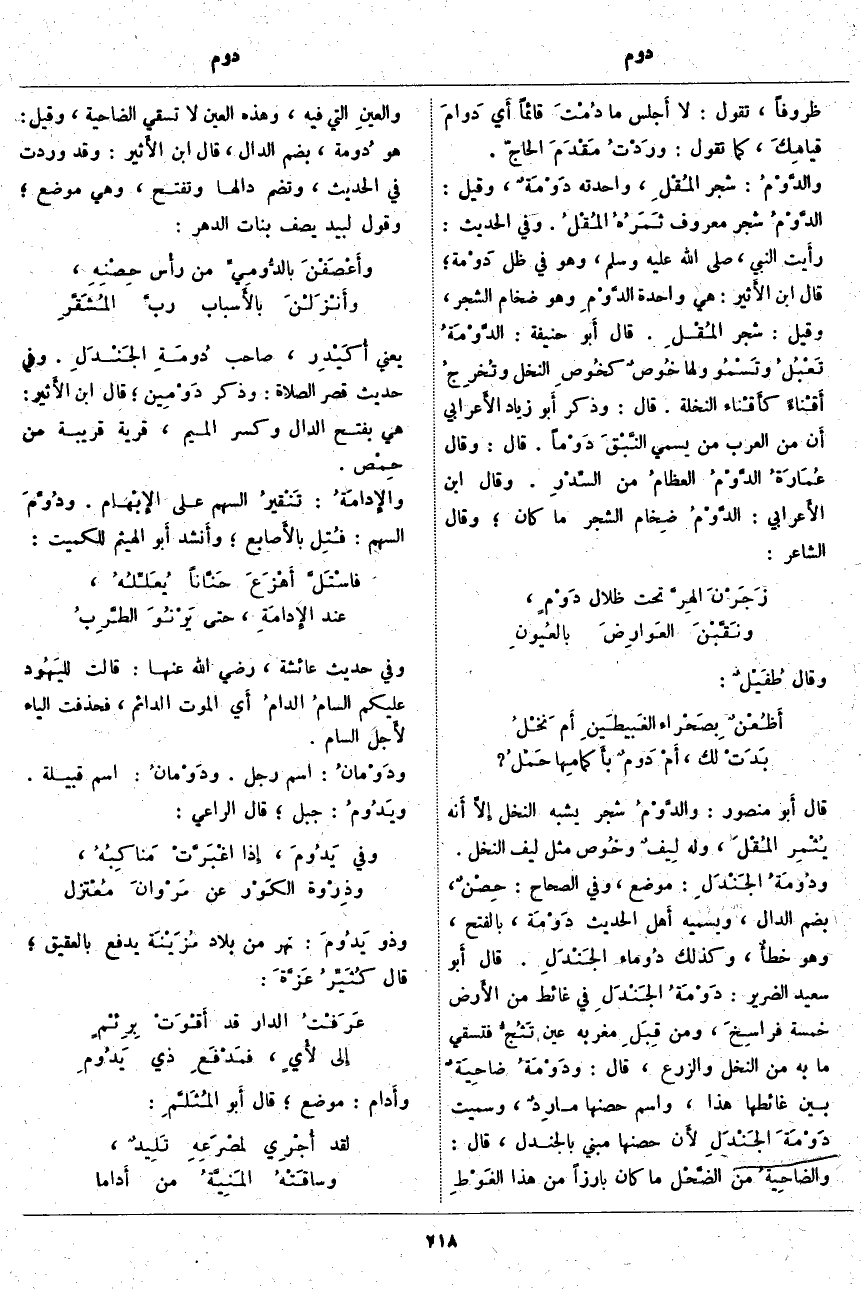 قَالَ أَبو مَنْصُورٍ: والدَّوْمُ شَجَرٌ يُشْبِهُ النَّخْلَ إِلَّا أَنه يُثْمِر المُقْلَ، وَلَهُ لِيفٌ وخُوص مِثْلُ لِيفِ النَّخْلِ. ودُومَةُ الجَنْدَلِ: مَوْضِعٌ، وَفِي الصِّحَاحِ: حِصْنٌ، بِضَمِّ الدَّالِ، وَيُسَمِّيهِ أَهل الْحَدِيثِ دَوْمَة، بِالْفَتْحِ، وَهُوَ خطأٌ، وَكَذَلِكَ دُوماء الجَنْدَلِ. قَالَ أَبو سَعِيدٍ الضَّرِيرُ: دَوْمَةُ الجَنْدَلِ فِي غَائِطٍ مِنَ الأَرض خَمْسَةُ فراسِخَ، وَمِنْ قِبَلِ مَغْرِبِهِ عَيْنٌ تَثُجُّ فَتَسْقِي مَا بِهِ مِنَ النَّخْلِ وَالزَّرْعِ، قَالَ: ودَوْمَةُ ضاحِيَةٌ بَيْنَ غَائِطِهَا هَذَا، وَاسْمُ حِصْنِهَا مارِدٌ، وَسُمِّيَتْ دَوْمَةَ الجَنْدَلِ لأَن حِصْنَهَا مَبْنِيٌّ بِالْجَنْدَلِ، قَالَ: والضاحِيةُ مِنَ الضَّحْل مَا كَانَ بَارِزًا مِنْ هَذَا الغَوْطِ والعينِ الَّتِي فِيهِ، وَهَذِهِ الْعَيْنُ لَا تَسْقِي الضَّاحِيَةَ، وَقِيلَ: هُوَ دُومة، بِضَمِّ الدَّالِ، قَالَ ابْنُ الأَثير: وَقَدْ وَرَدَتْ فِي الْحَدِيثِ، وَتُضَمُّ دَالُهَا وَتُفْتَحُ، وَهِيَ مَوْضِعٌ؛ وَقَوْلُ لَبِيدٍ يَصِفُ بَنَاتَ الدَّهْرِ: