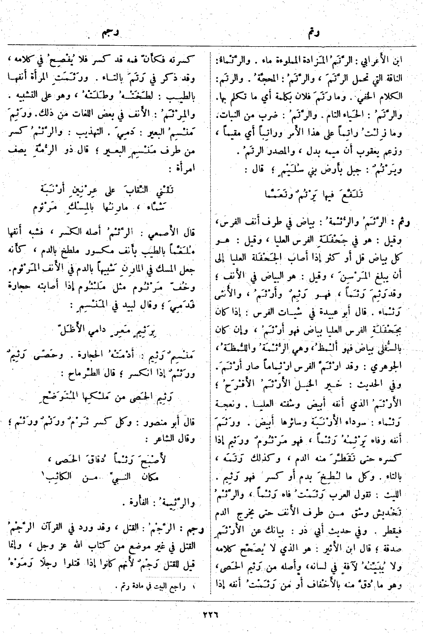 رثم: الرَّثَمُ والرُّثْمةُ: بَيَاضٌ فِي طَرَفِ أَنف الْفَرَسِ، وَقِيلَ: هُوَ فِي جَحْفَلَةِ الْفَرَسِ الْعُلْيَا، وَقِيلَ: هُوَ كُلُّ بَيَاضٌ قَلَّ أَو كَثُرَ إِذا أَصاب الجَحْفَلة الْعُلْيَا إِلى أَن يَبْلُغَ المَرْسِنَ، وَقِيلَ: هُوَ الْبَيَاضُ فِي الأَنف؛ وَقَدْ رَثِمَ رَثَماً، فَهُوَ رَثِمٌ وأَرْثَمُ، والأُنثى رَثْماء. قَالَ أَبو عُبَيْدَةَ فِي شِيَاتِ الْفَرَسِ: إِذا كَانَ بجَحْفَلَةِ الْفَرَسِ الْعُلْيَا بَيَاضٌ فَهُوَ أَرْثَمُ، وإِن كَانَ بالسُّفلى بَيَاضٌ فَهُوَ أَلْمظُ، وَهِيَ الرُّثْمَةُ واللُّمظَةُ، الْجَوْهَرِيُّ: وَقَدِ ارْثَمَّ الْفَرَسُ ارْثِماماً صَارَ أَرْثَمَ. وَفِي الْحَدِيثِ: