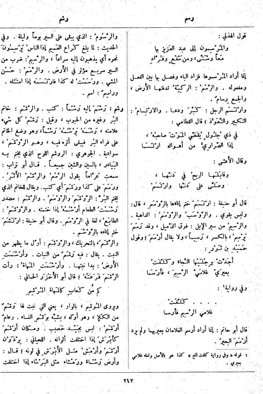 إِنما أَراد المُرْسموها فَزَادَ الْبَاءَ وَفَصَلَ بِهَا بَيْنَ الْفِعْلِ وَمَفْعُولِهِ. والرَّسْمُ: الركِيّةُ تَدْفِنُهَا الأَرض، وَالْجَمْعُ رِسامٌ. وارْتَسَم الرَّجُلُ: كَبَّرَ وَدَعَا. والارْتِسامُ: التَّكْبِيرُ والتَّعَوُّذ؛ قَالَ الْقَطَامِيُّ: